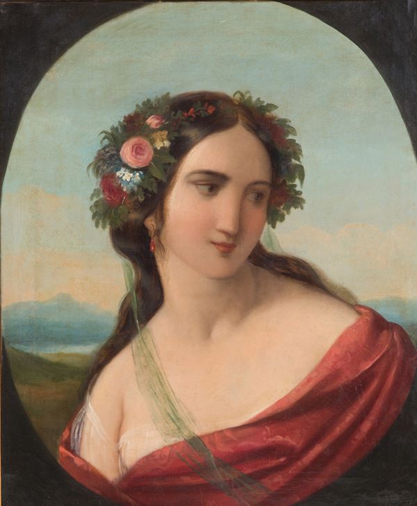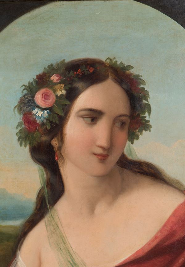 Dipinto olio su tela raffigurante "PRIMAVERA". Fine XIX secolo. In cornice. Restauri.