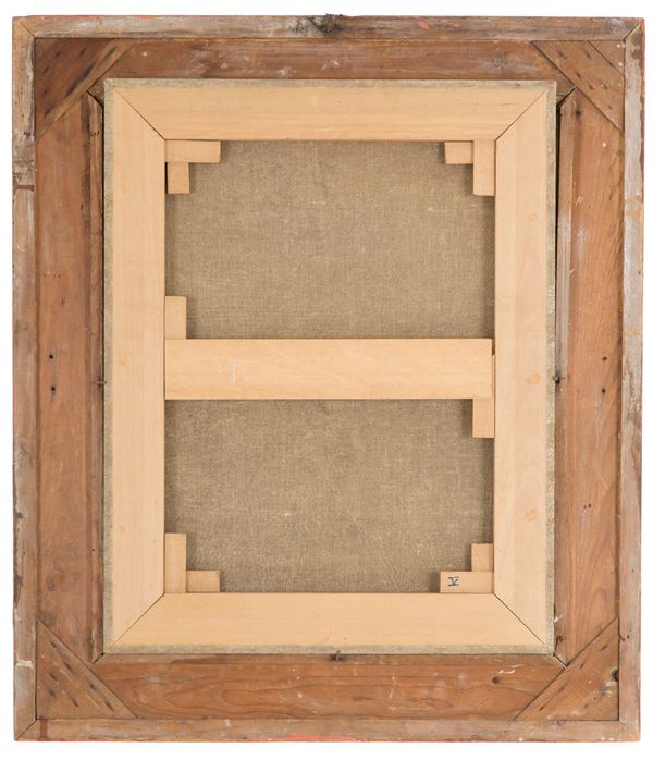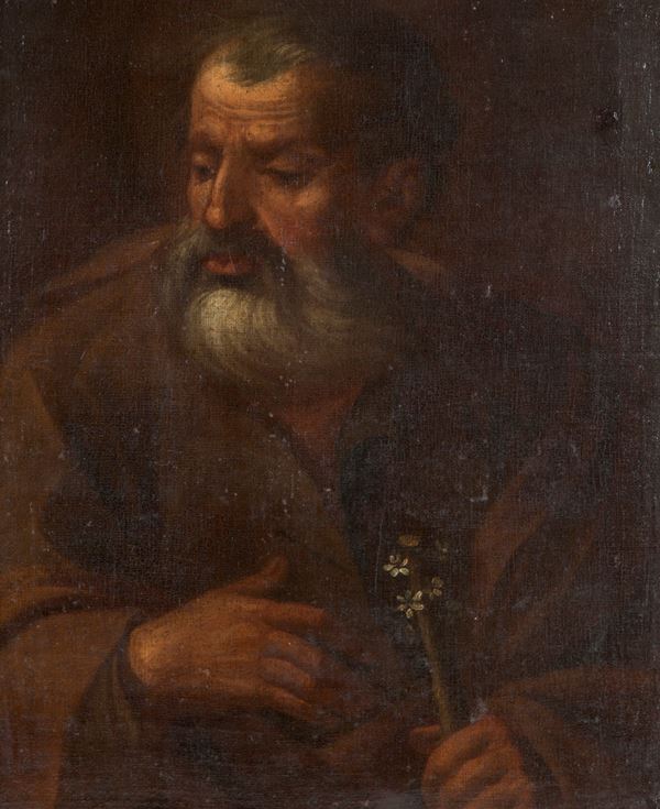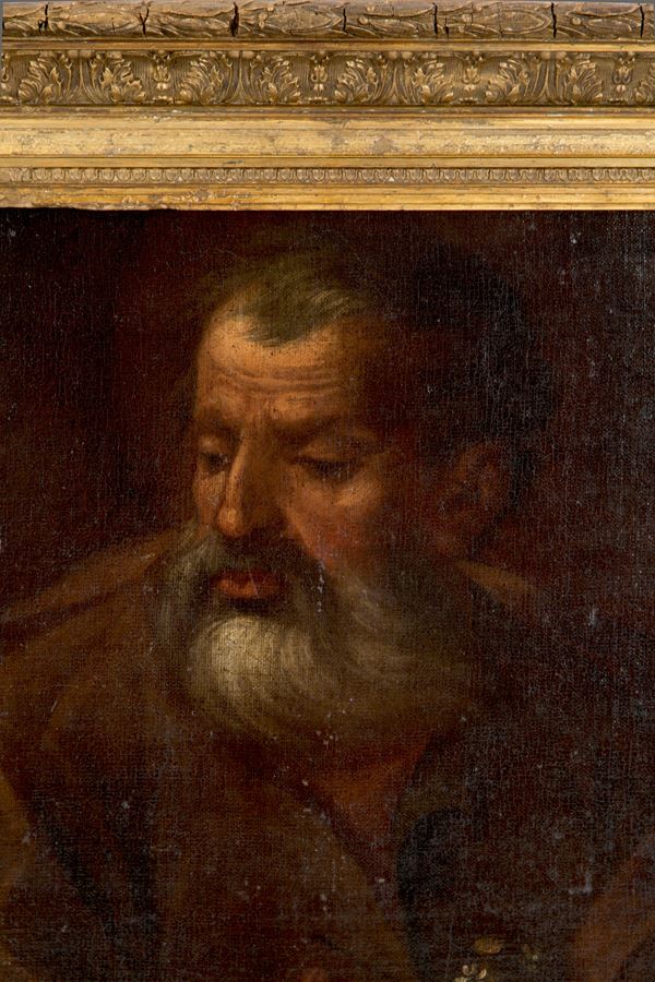 Dipinto olio su tela raffigurante "SAN GIUSEPPE". XVII secolo. In cornice dorata. Già rintelato e rintelaiato. Lievi restauri.