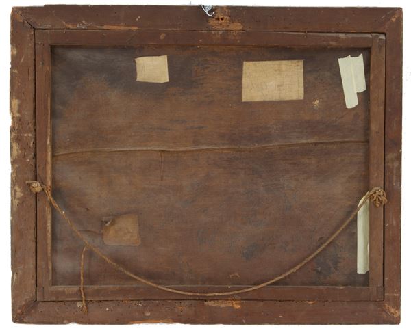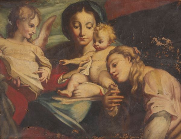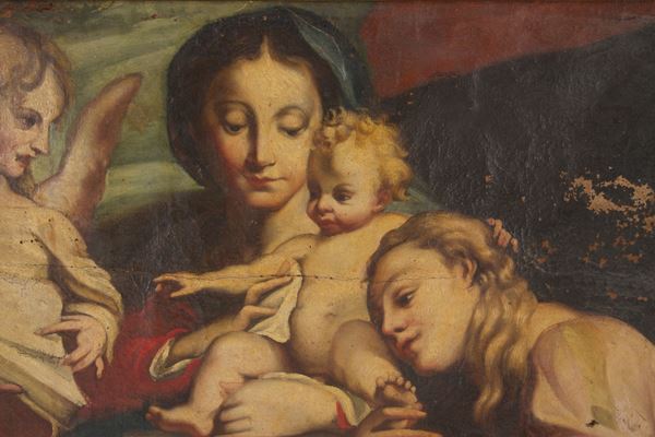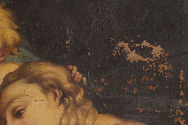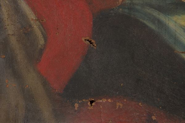 Dipinto olio su tela raffigurante "SPOSALIZIO MISTICO DI SANTA CATERINA CON ANGELO". XVIII secolo. In cornice coeva. Difetti e restauri.
