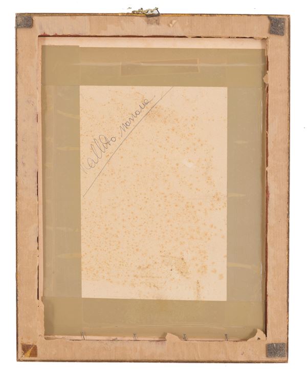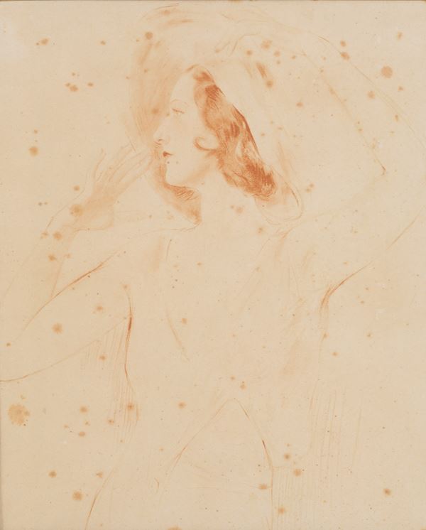 Disegno a sanguigna su carta raffigurante "DONNA CON CAPPELLO". XX secolo. In cornice. Difetti.