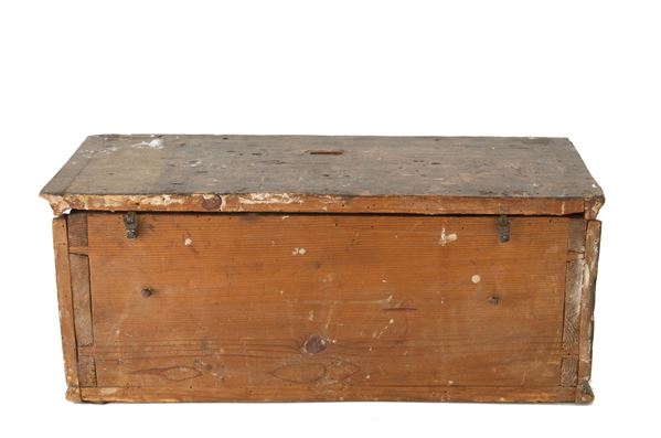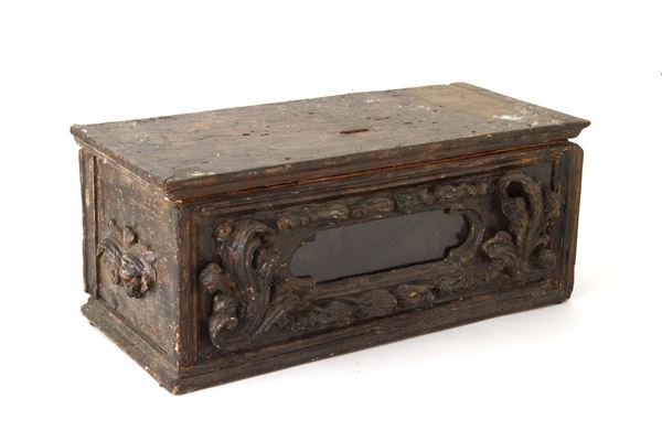 Elemosiniere in legno intagliato e laccato con finestrella in vetro. XVII secolo. Difetti.