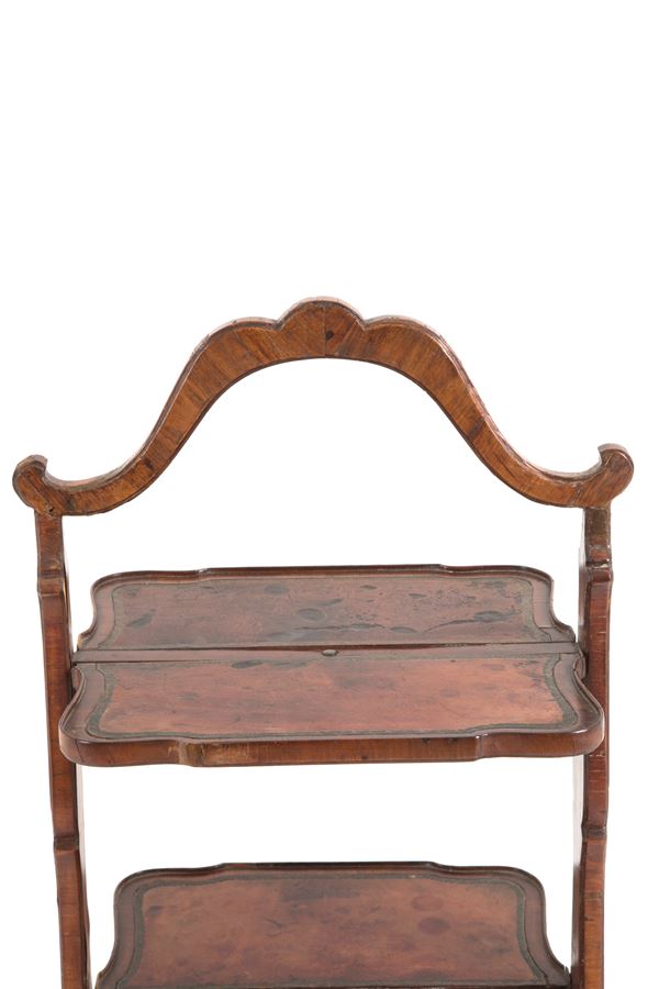 Etagere apribile in legno lastronato e cuoio sui piani. Francia. XIX secolo. Difetti e mancanze.