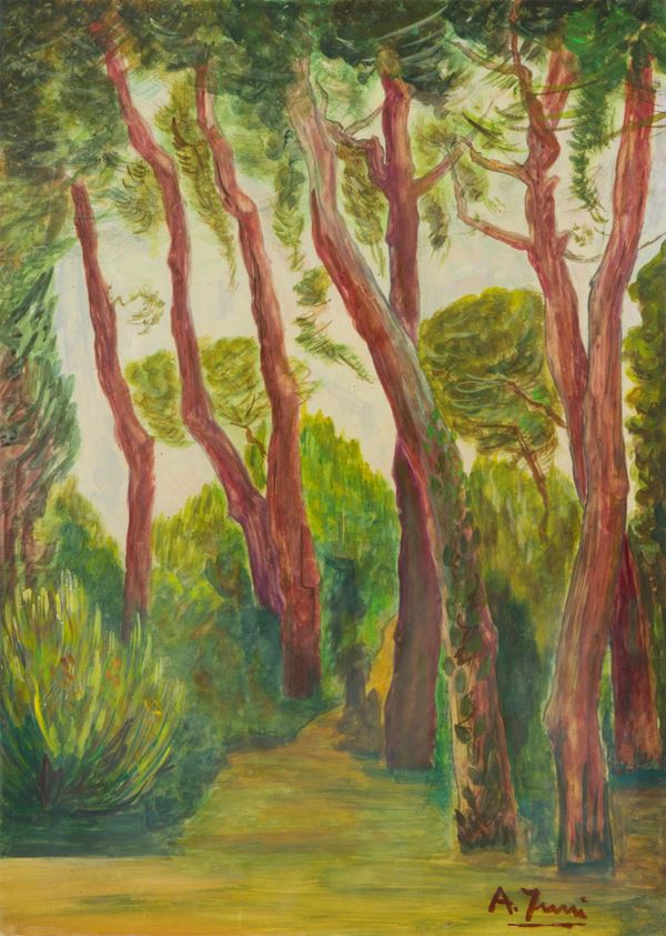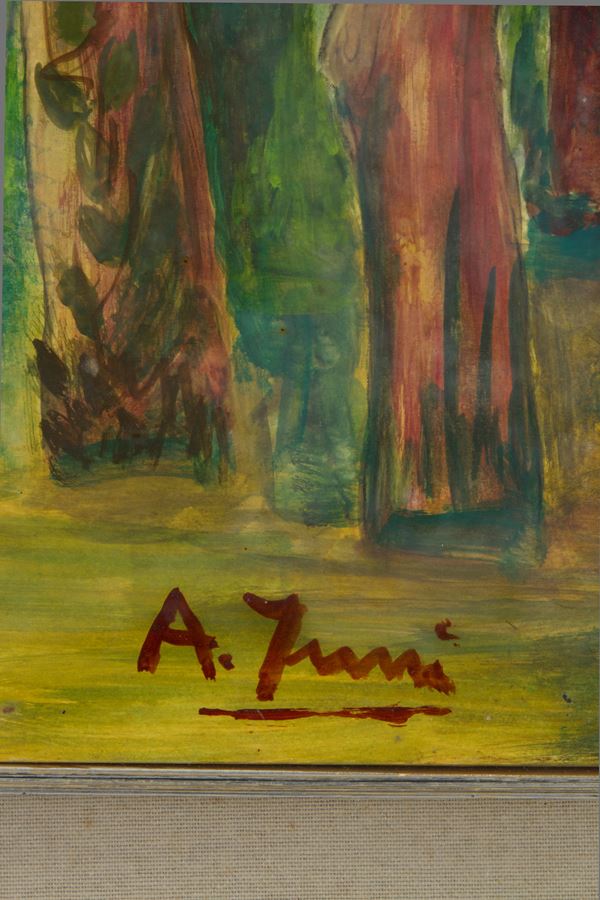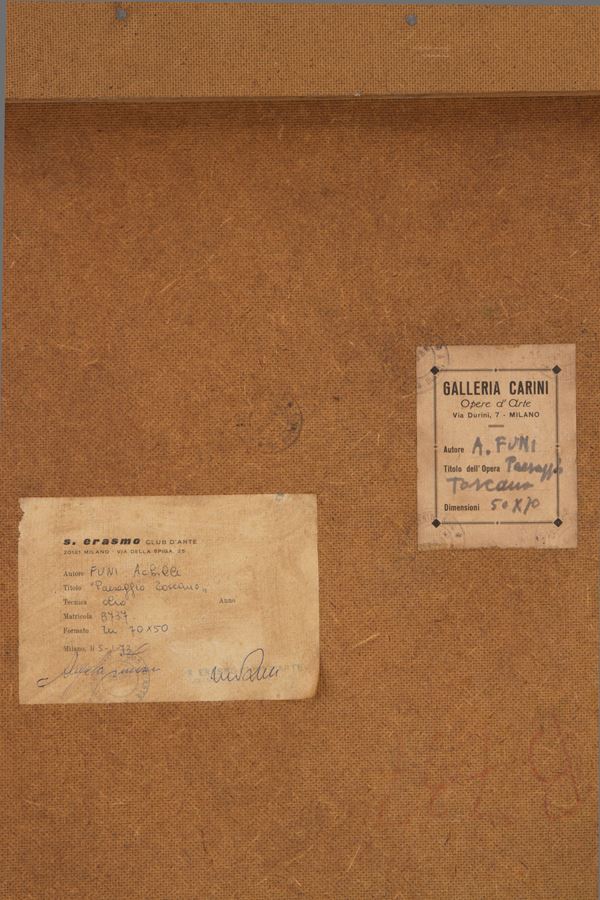 Dipinto tempera su carta applicata su masonite raffigurante "BOSCO IN VERSILIA". Firmato in basso a destra. Con cartigli delle gallerie Sant'Erasmo, via della Spiga, 25 Milano e della Galleria Carini, via Durini 7, Milano sul retro. In cornice. Con numero di archiviazione P.96-F.40, presso l'Archivio Achille Funi, Studio d’arte Nicoletta Colombo, Milano.