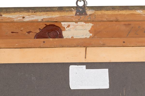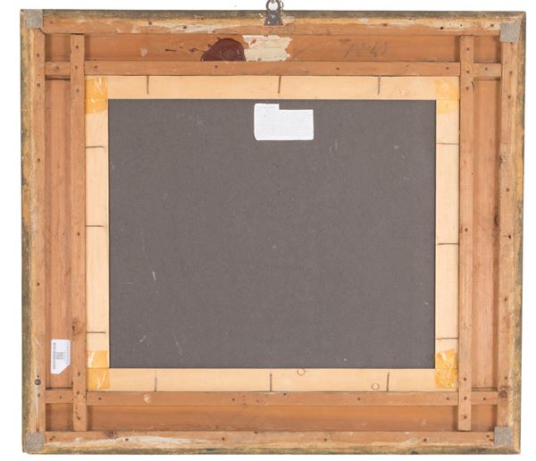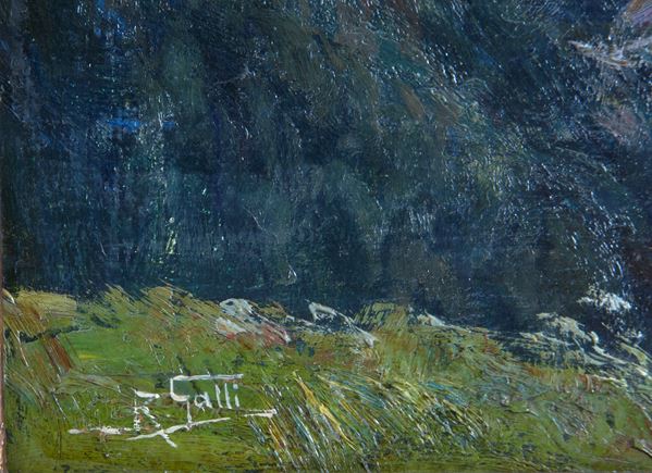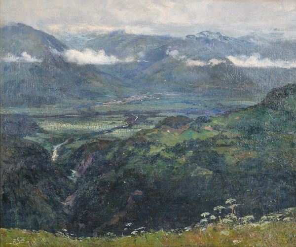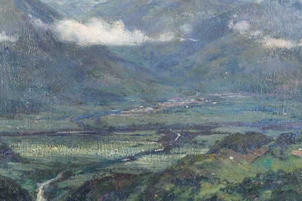 Dipinto olio su tavola raffigurante "PAESAGGIO MONTANO". Firmato in basso a sinistra. In cornice dorata. Con parziale cartiglio della Permanente di Milano sul retro.