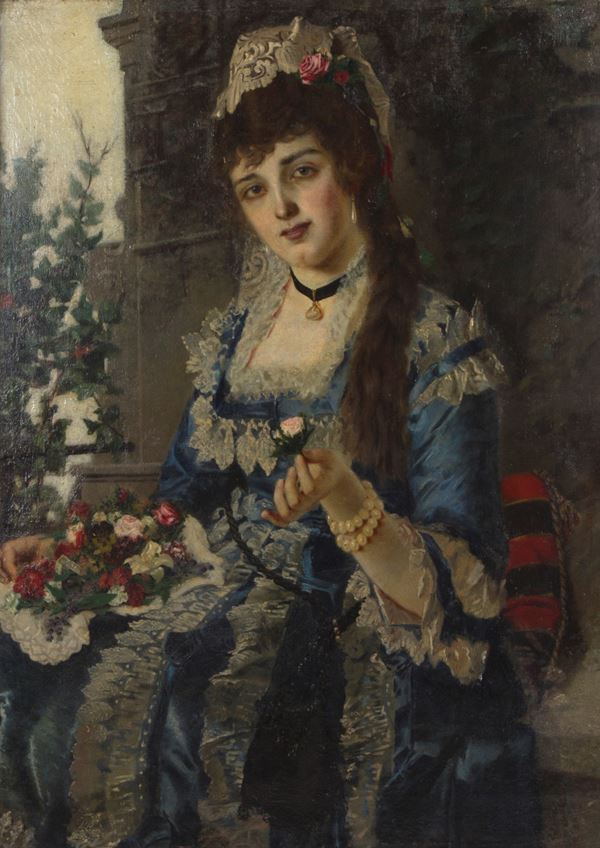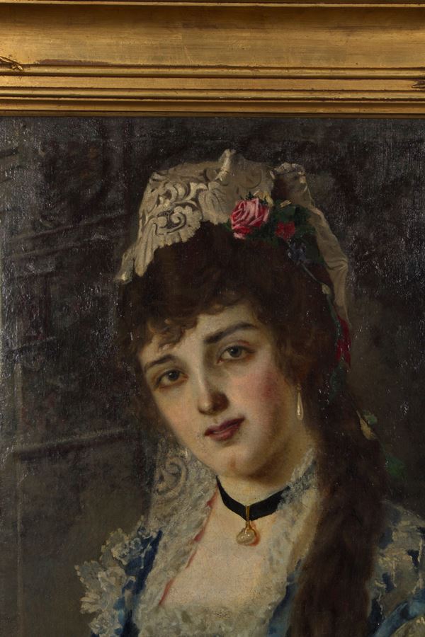 Dipinto olio su tela intitolato "MARGHERITA NELL'OPERA FAUST". Firmato in alto a destra. Capo d'opera dell'artista. In cornice.