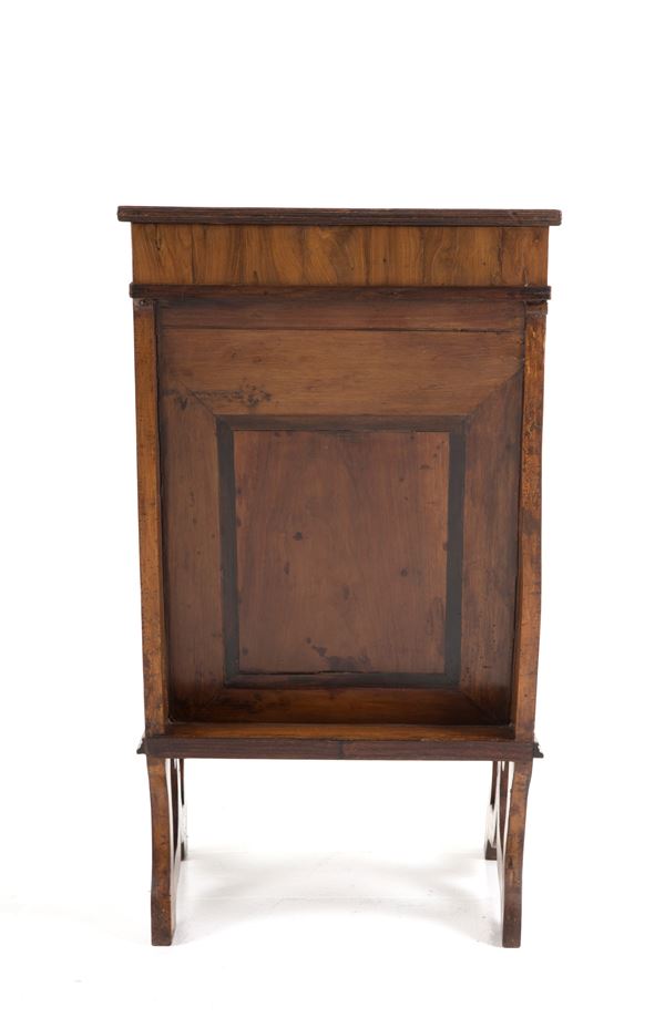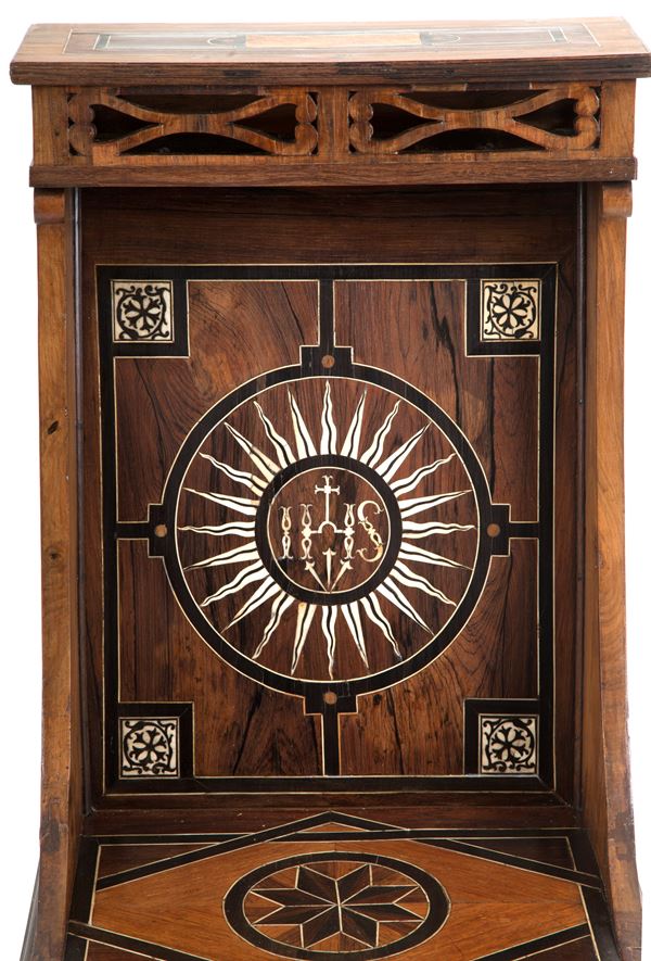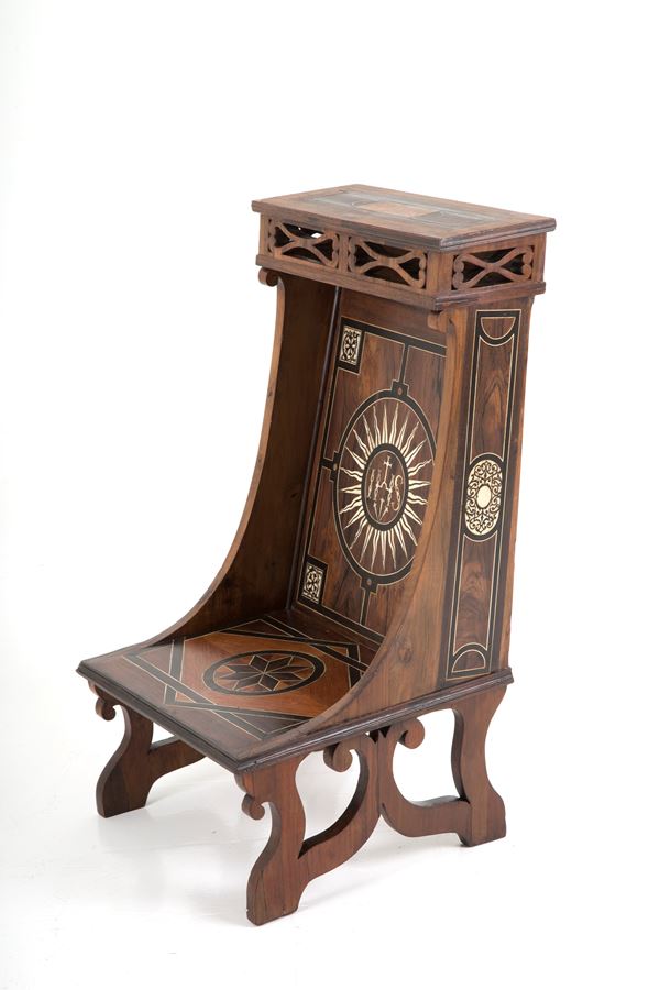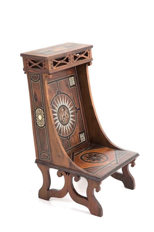 Inginocchiatoio lastronato e intarsiato in legni vari e osso. Lombardia. Inizi XIX secolo.