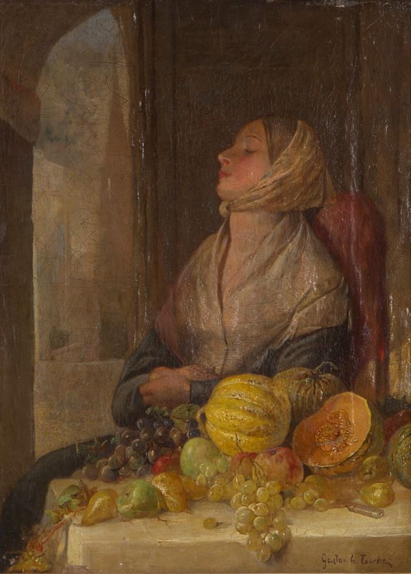 Dipinto olio su tela raffigurante ''GIOVANE DONNA CON NATURA MORTA''. Firmato in basso a destra. Con perizia fotografica del Prof. Giacomo Migone. In cornice. Difetti e rintelo.