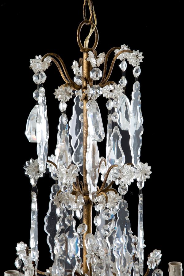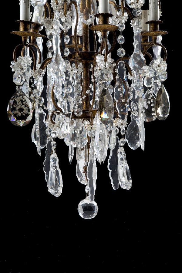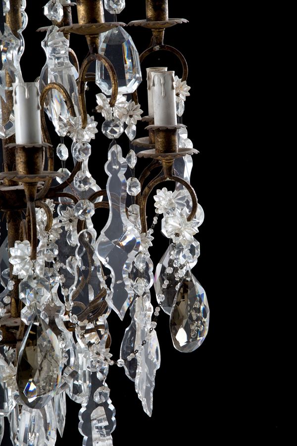 Lampadario in ferro dorato con gocce. XX secolo. Un braccio rotto.