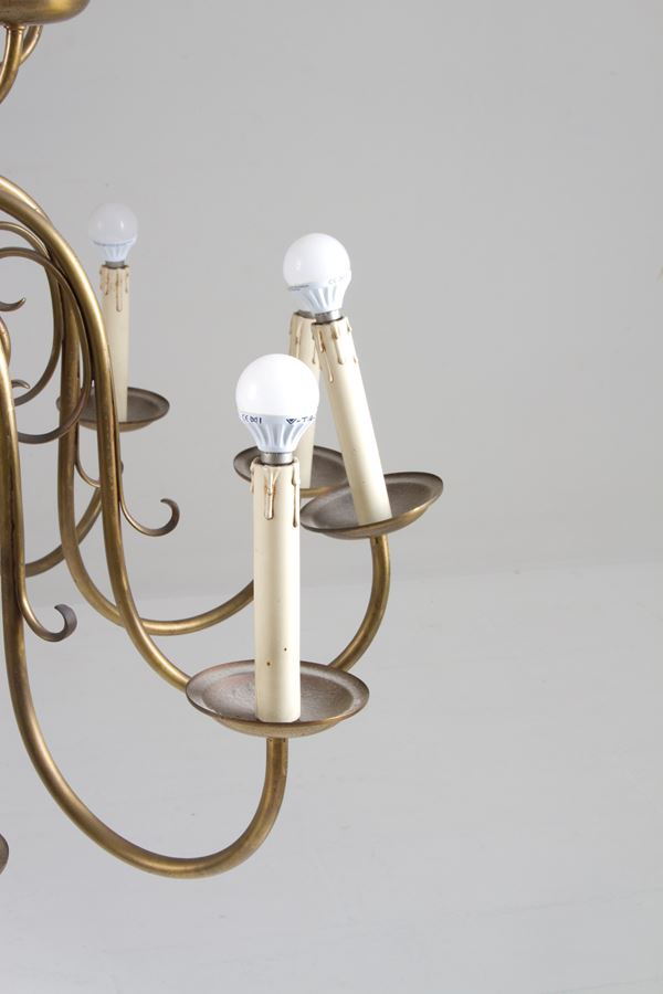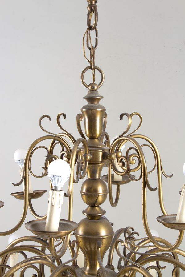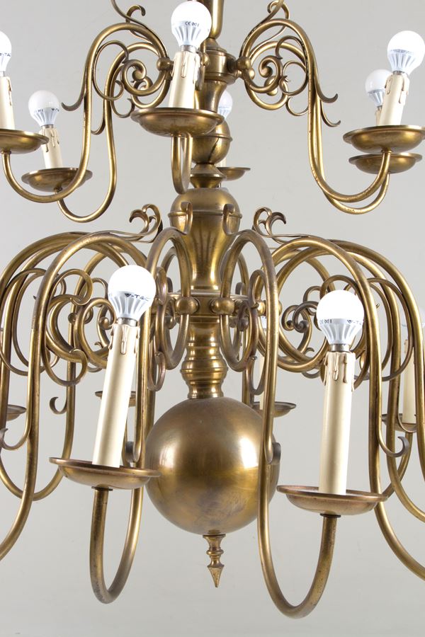 Lampadario diciotto luci su due palchi in ottone. Stile olandese. XX secolo. Segni di usura del tempo.