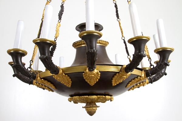 Lampadario dodici luci in bronzo patinato e dorato. Periodo Napoleone III. Lievi difetti.