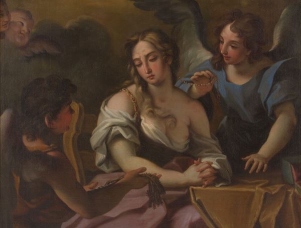 Dipinto olio su tela raffigurante "IL PENTIMENTO DI MARIA MADDALENA". In cornice dorata. Già rintelato e rintelaiato. Restauri.