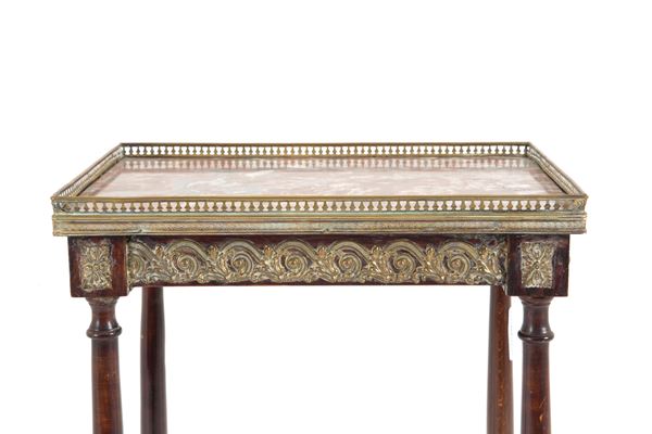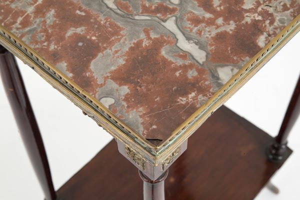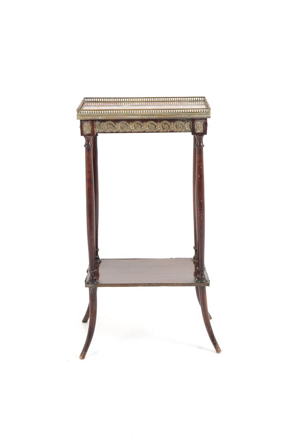 Mobiletto da centro in mogano con colonne tornite, gambe a sciabola, applicazioni in bronzo dorato e piano in marmo. Periodo Napoleone III. Difetti.
