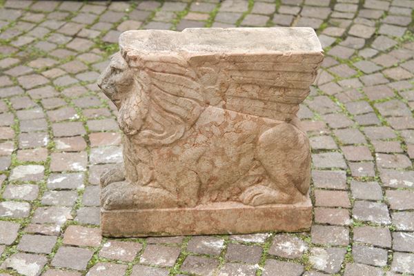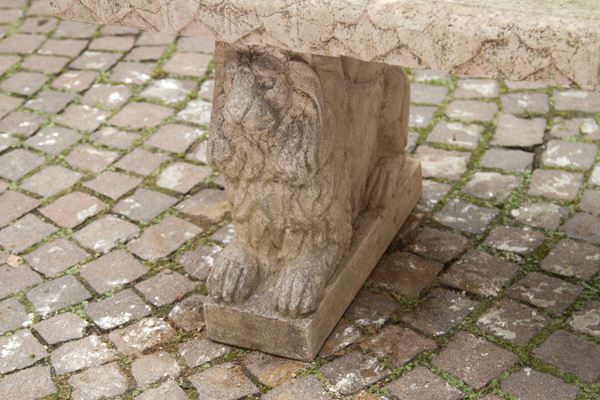 Panchina da giardino in agglomerato di pietra con piedi a foggia di leoni in marmo rosso di Verona. XIX secolo. Difetti.