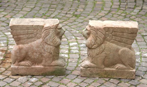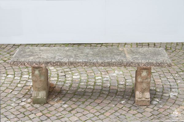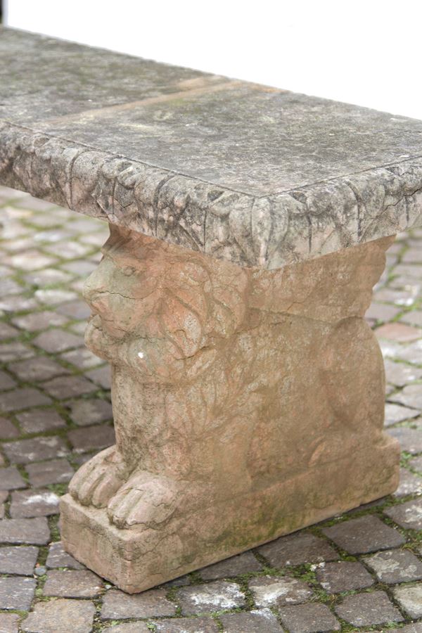 Panchina da giardino in agglomerato di pietra con piedi a foggia di leoni in marmo rosso di Verona. XIX secolo. Difetti.