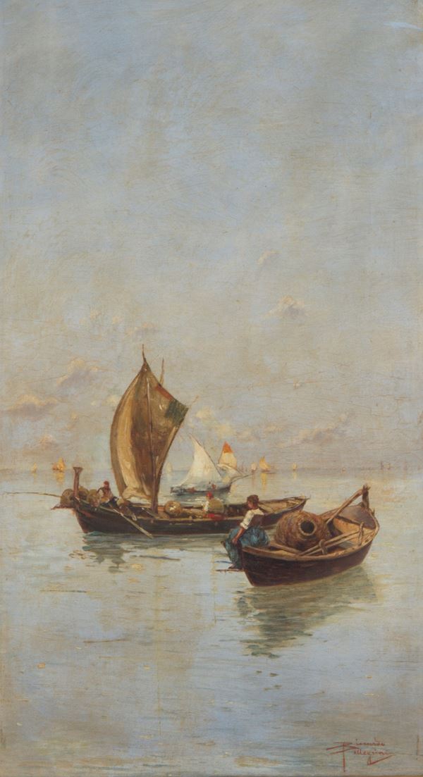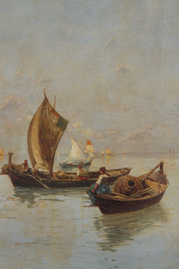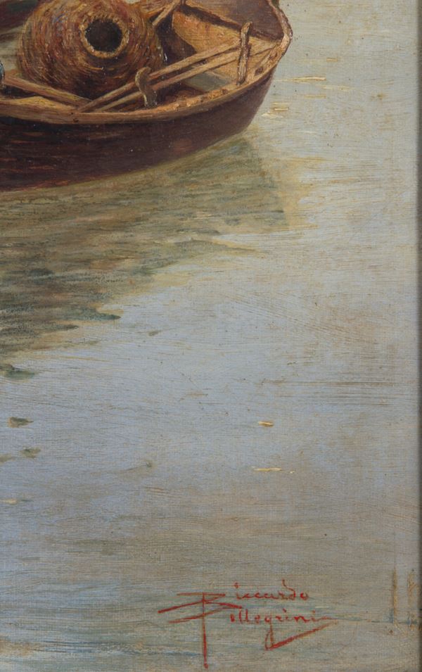 Dipinto olio su tela raffigurante "BARCHE CON PESCATORI". Firmato in basso a destra. In cornice dorata.