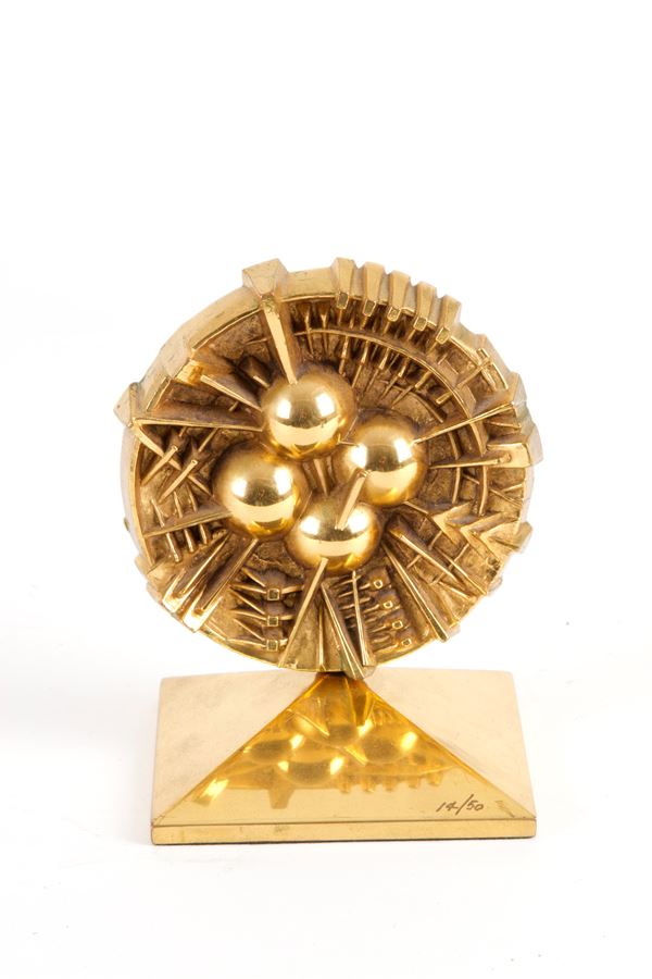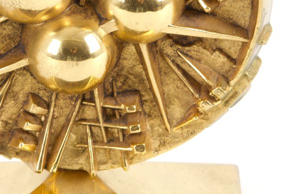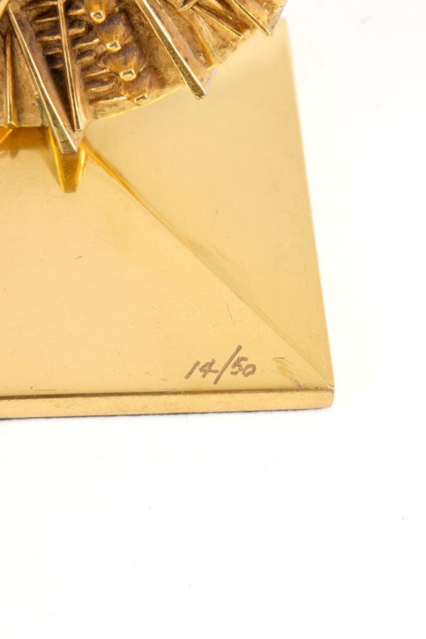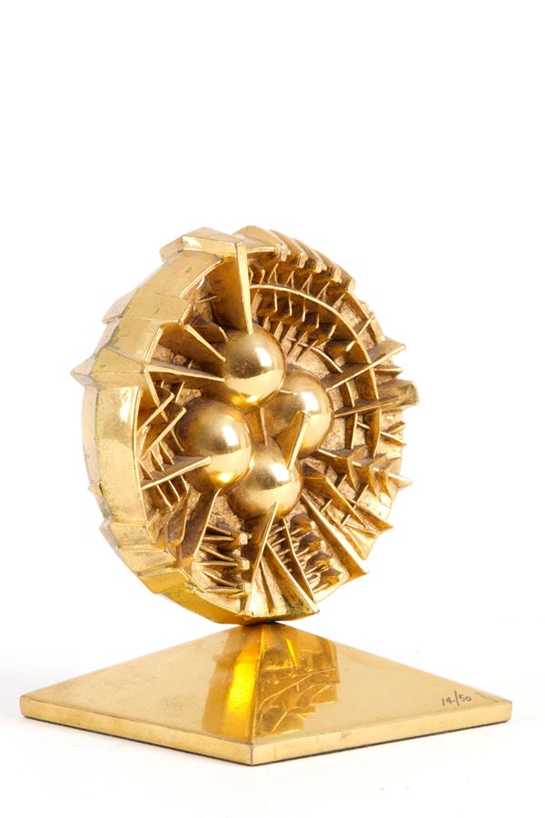 Scultura in bronzo dorato intitolata "DISCO". Firmata e con marchio della fonderia Johnson sul retro. Esemplare 14/50. 2005. Con autentica della fondazione. Segni di usura del tempo.