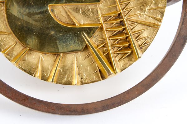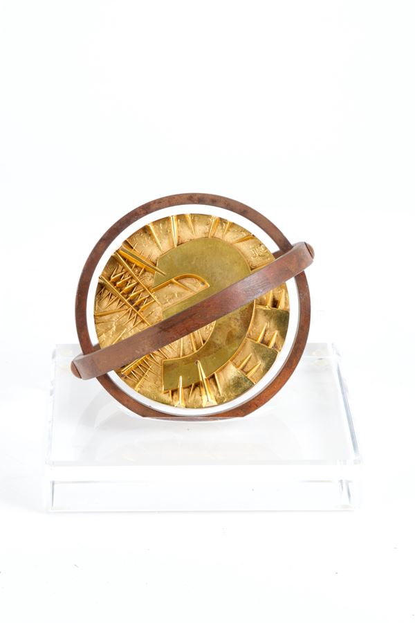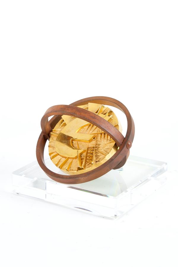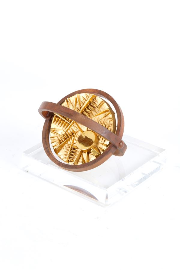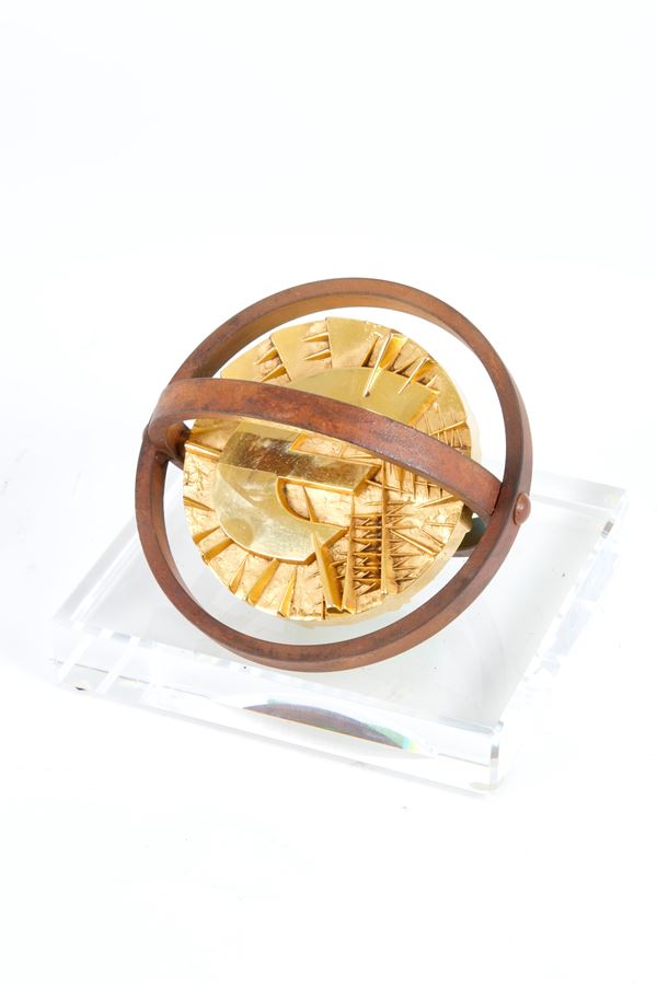 Scultura in bronzo dorato e ferro intitolata "GIROSCOPIO". Tiratura di 250 esemplari. Firmata, datata 2002/03 e con marchio della fonderia Stefano Johnson sul retro. Con autentica della fondazione e numero di archivio M/02/4. Con base in plexiglass.
