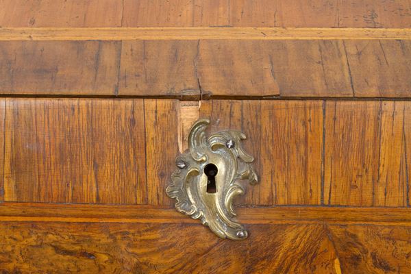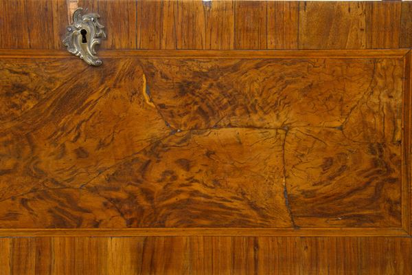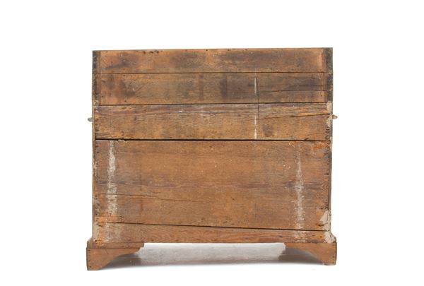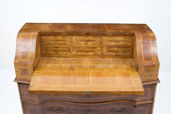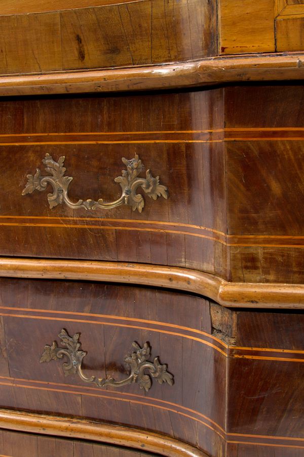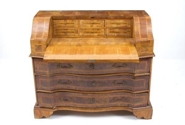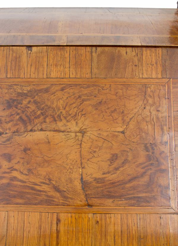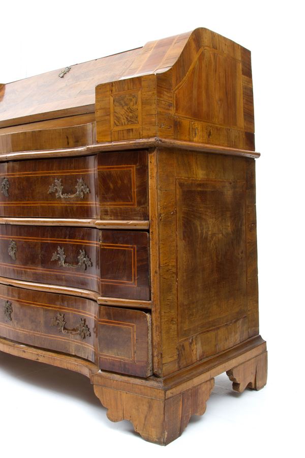 Ribalta mossa sul fronte in legno lastronato e filettato a tre cassetti. Verona. XVIII secolo. Difetti.