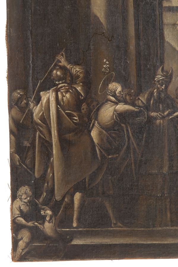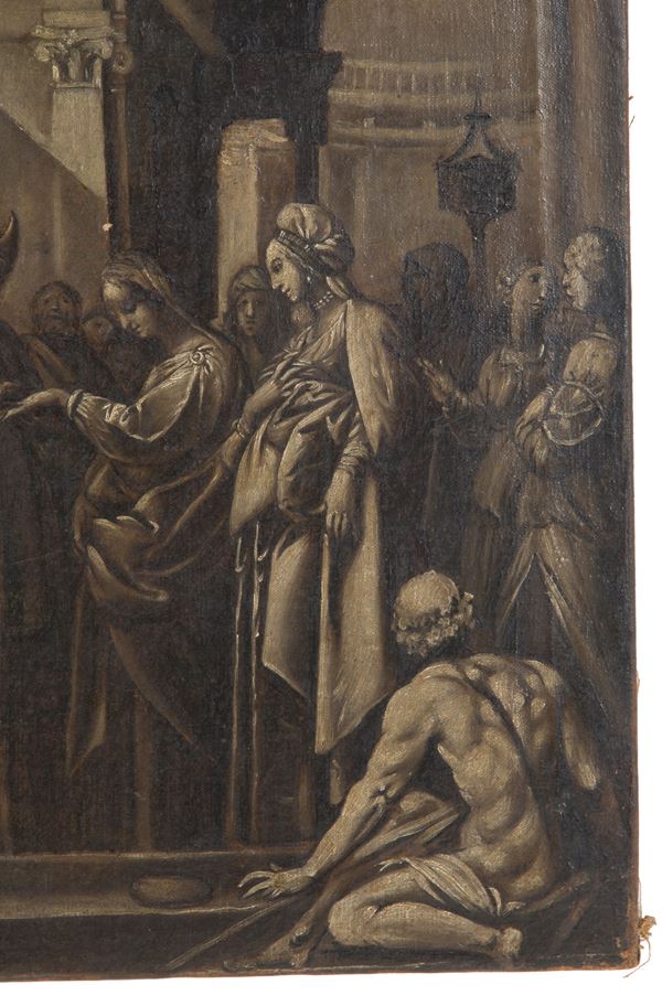 Dipinto olio su tela raffigurante "LO SPOSALIZIO DELLA VERGINE". Con scritta sul retro. Vecchio rintelo e già rintelaiato. Restauri.