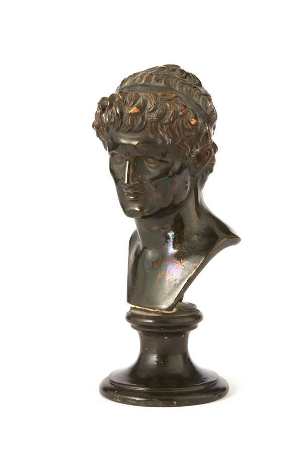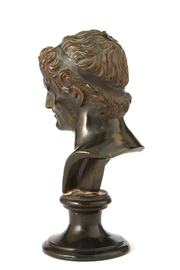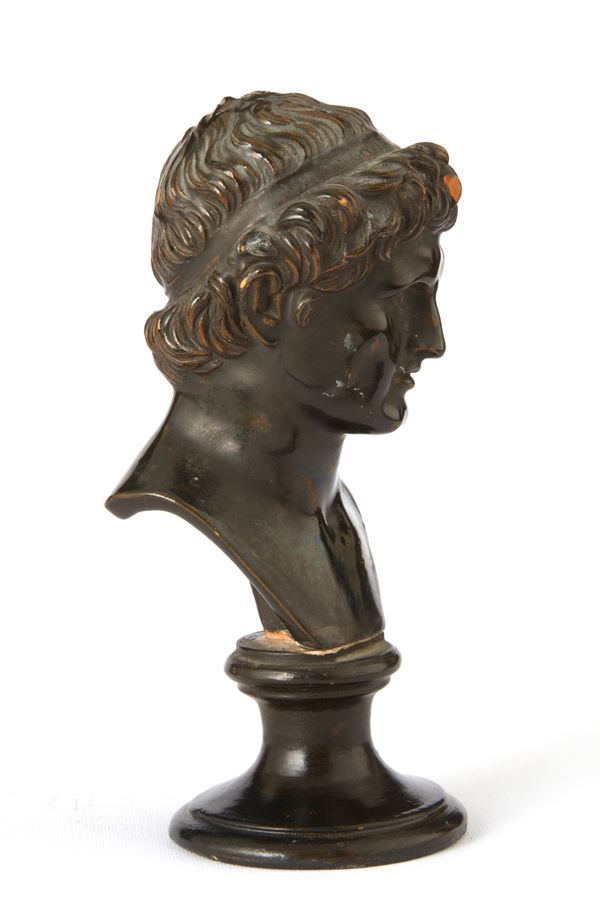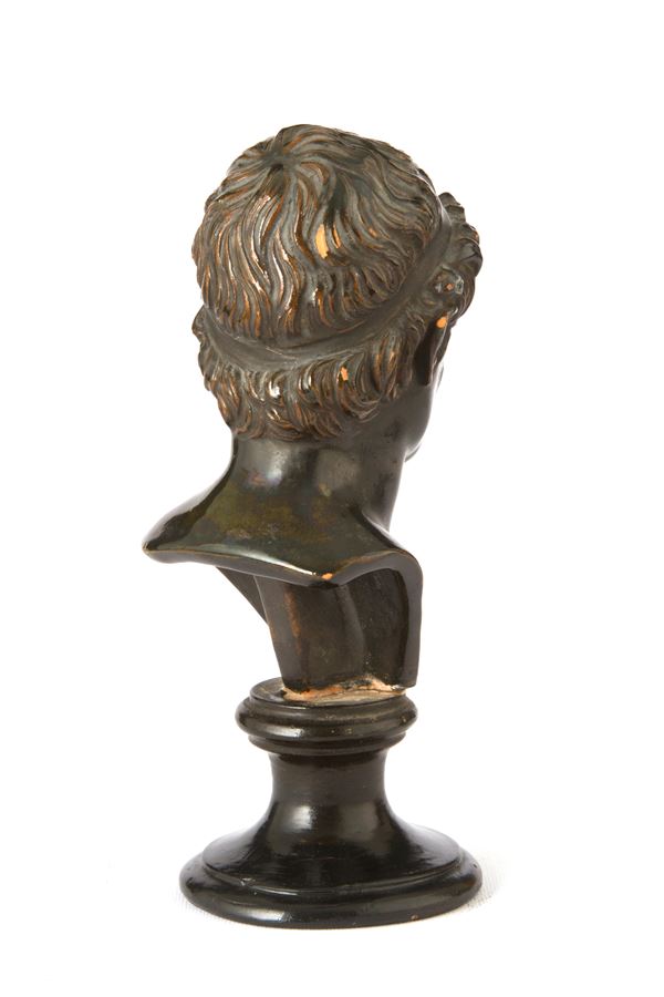 Scultura in terracotta patinata ad effetto bronzo raffigurante "TESTA DI GIULIO CESARE". XIX secolo. Difetti.