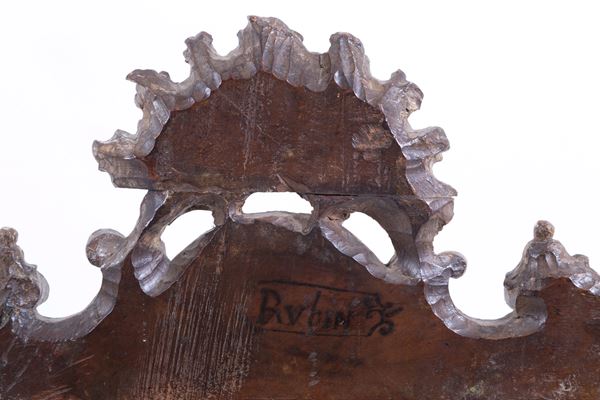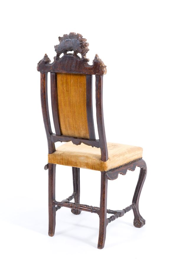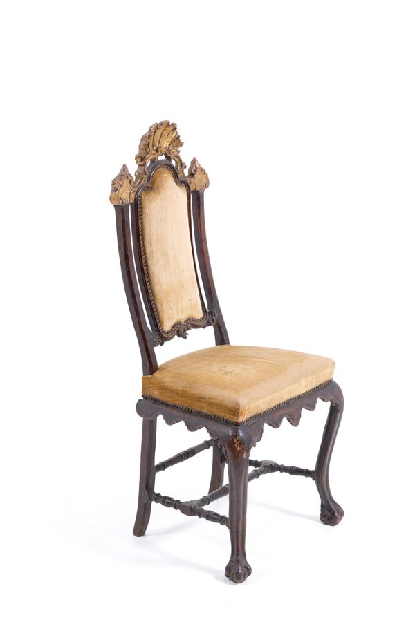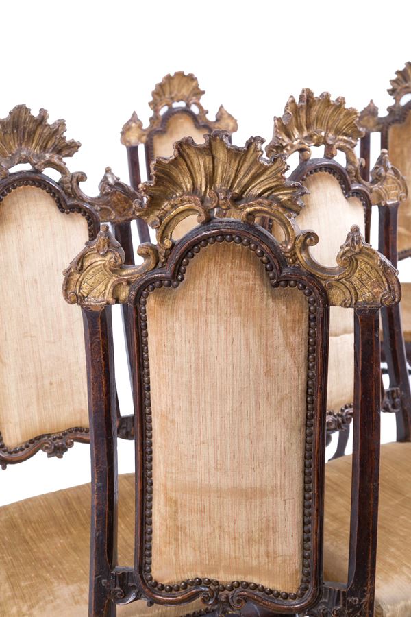 Sei importanti sedie in noce tinto con fregi dorati a rocaille e piedi leonini. Gambe mosse unite da traverse tornite. Venezia. Periodo transizione Luigi XIV-XV. Lievi difetti.