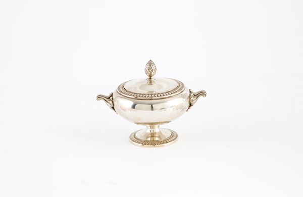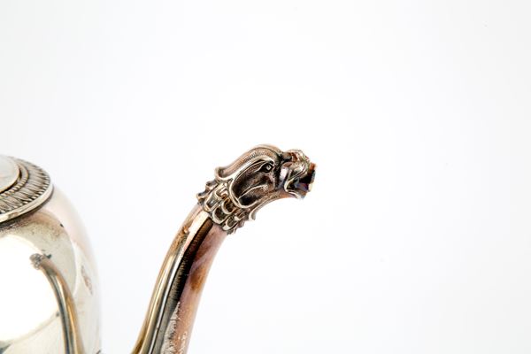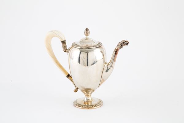 Servizio da tè in argento 800 composto da zuccheriera, teiera e caffettiera, gr. 2000 ca. complessivi. Punzoni sul fondo. XX secolo.