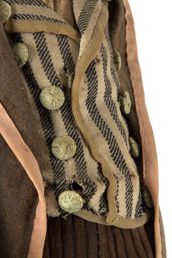 Statua da presepe raffigurante "VECCHIO CON MARSINA" in legno intagliato e laccato e vestiti d'epoca. Base in legno. XVIII secolo. Difetti e mancanze.
