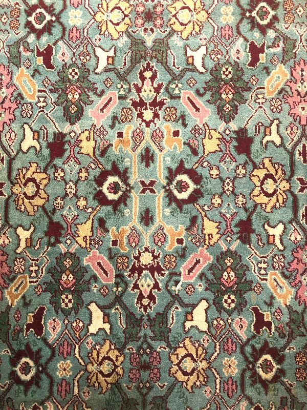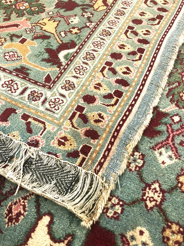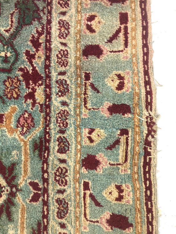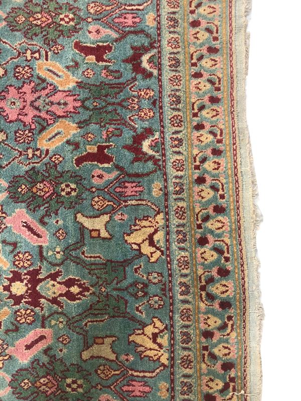 Tappeto Agra. India. Fine XIX secolo. Ottimo stato di conservazione, campo in vello e quattro lati originali, piccolissimo punto da sistemare sul bordo (2x1 cm).