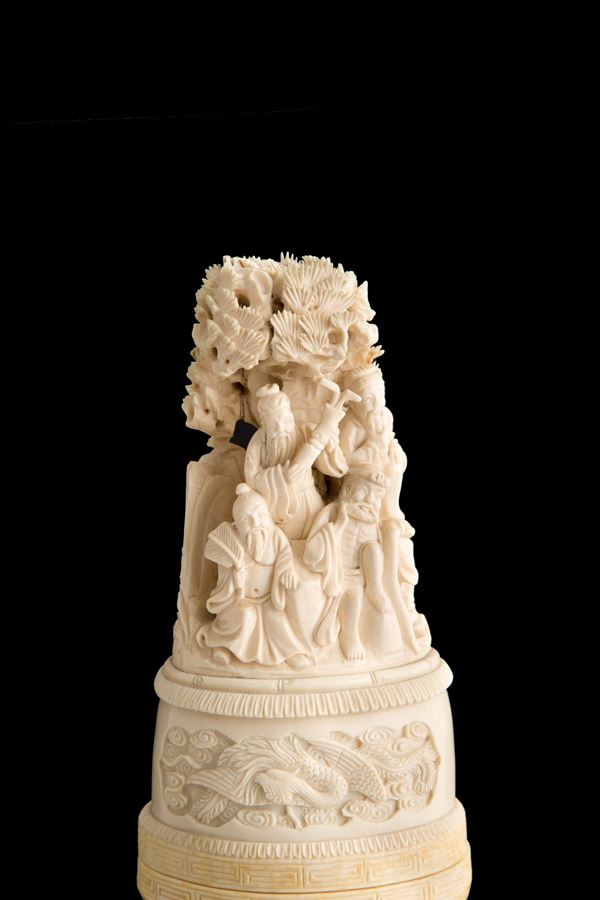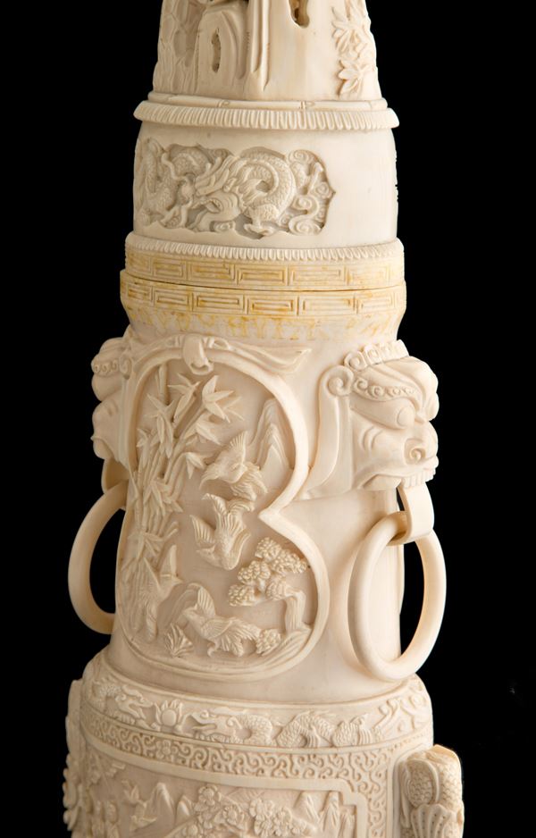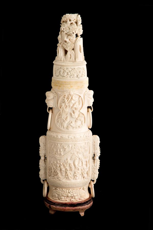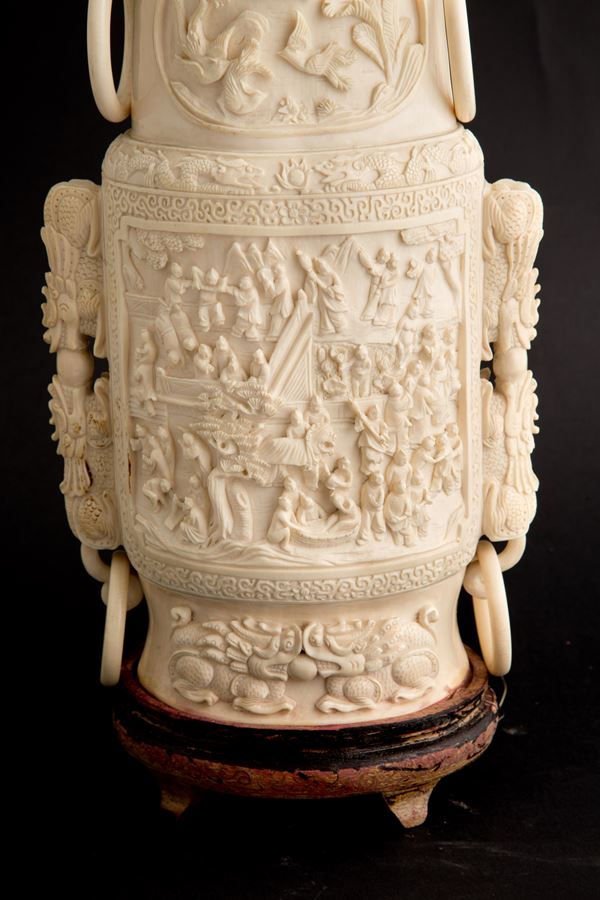 Vaso in avorio finemente intagliato con scene di vita, dragoni ed elementi fitomorfi, corredato di tappo e doppio manico circolare. Base in legno originale. Cina. Inizi XX secolo. Con certificato CITES.