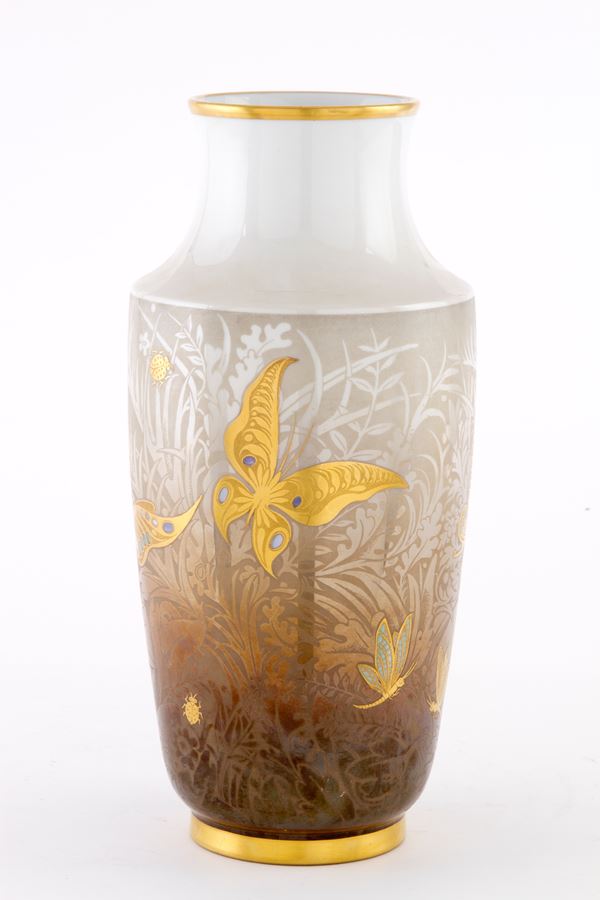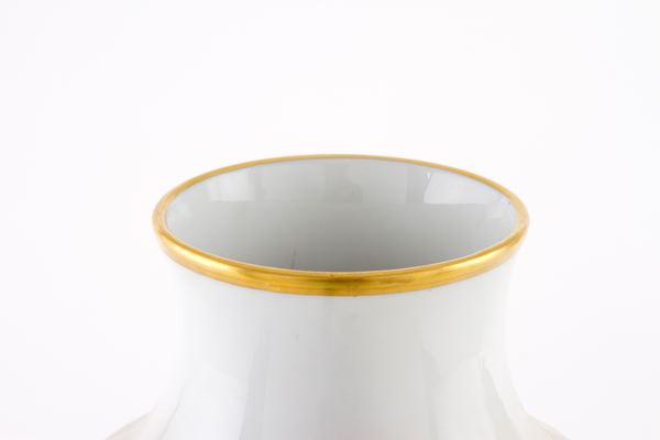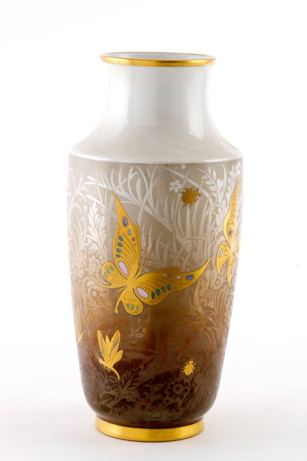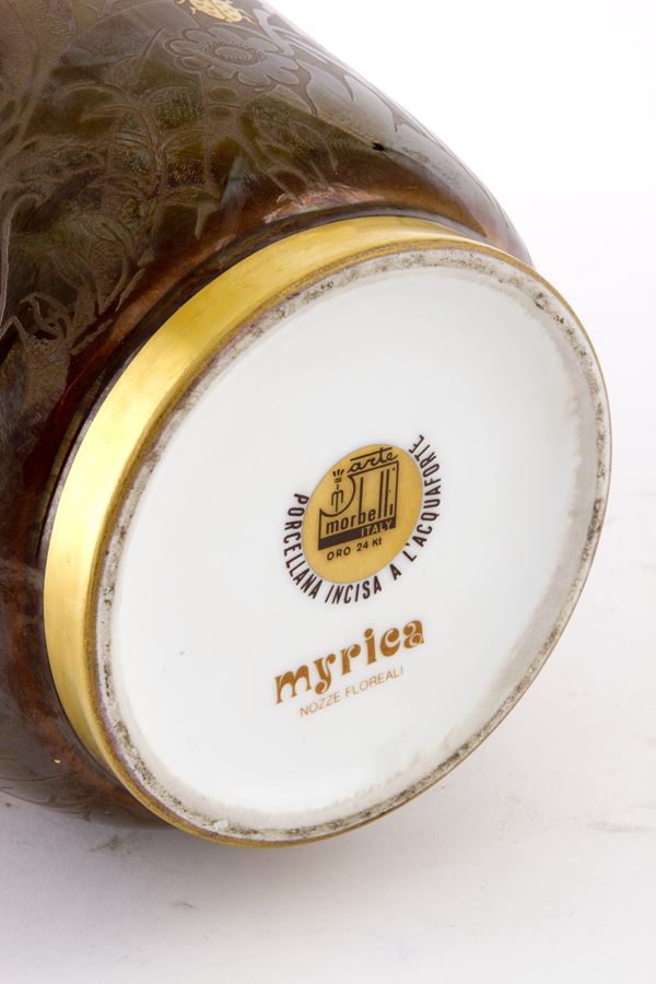 Vaso in porcellana inciso all'acquaforte in oro 24 kt della serie Myrica, nozze floreali. Produzione ARTE MORBELLI, Italia. Marcato sul fondo.