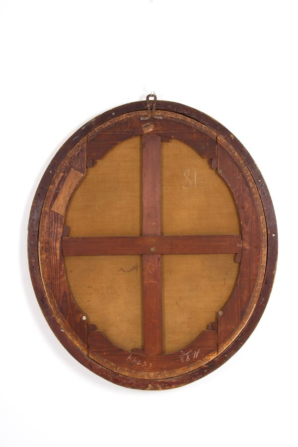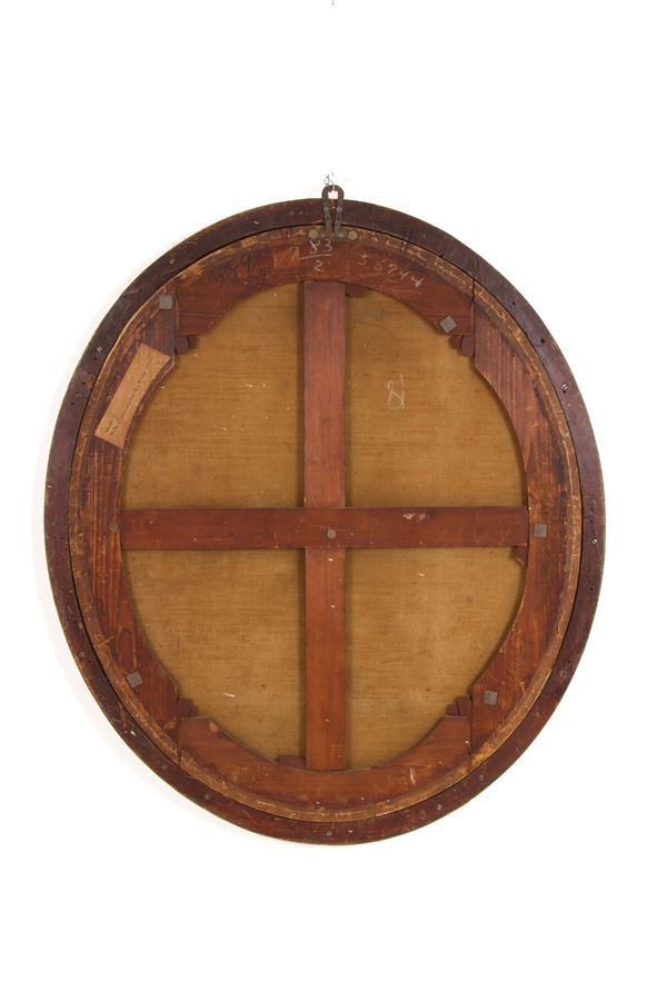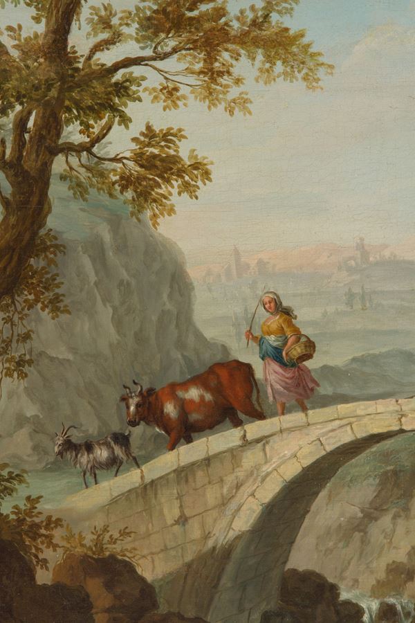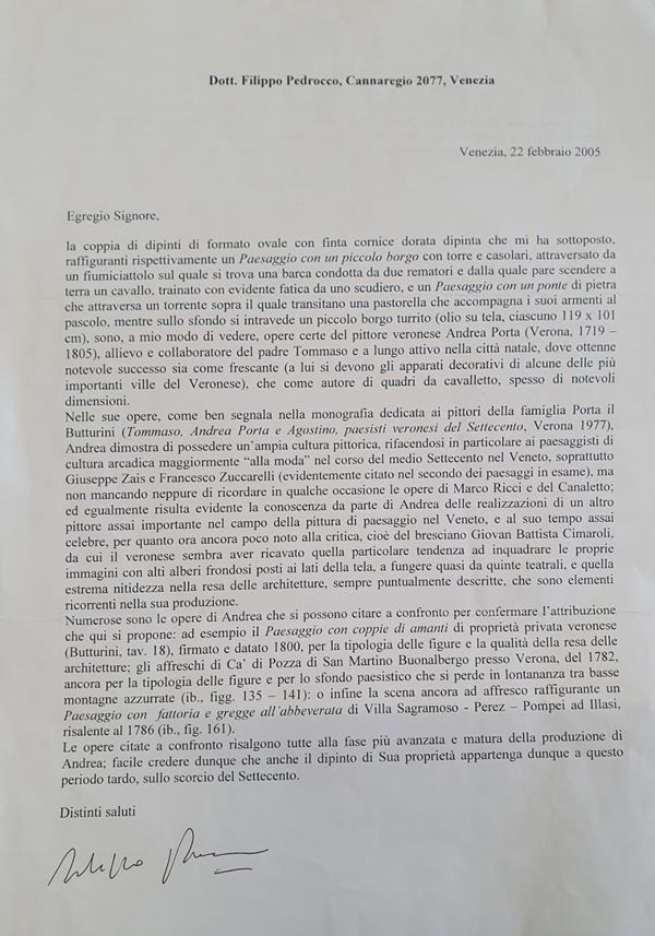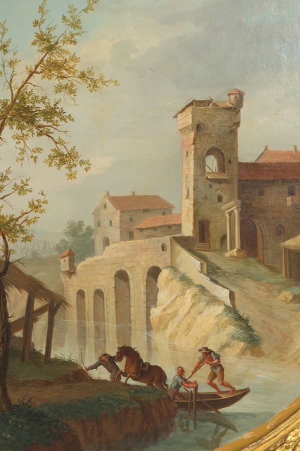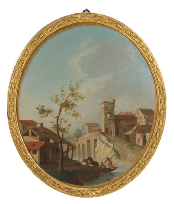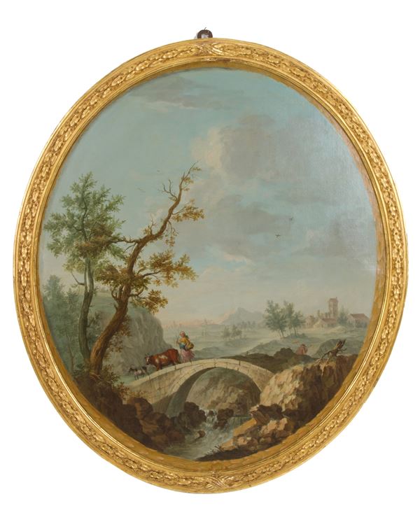 Coppia di dipinti ovali olio su tela raffiguranti "PAESAGGIO CON UN PICCOLO BORGO" e "PAESAGGIO CON UN PONTE". In cornici intagliate e dorate. Restauri. Già rintelati. Con lettera di attribuzione del Dott. Filippo Pedrocco.