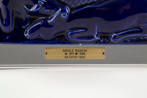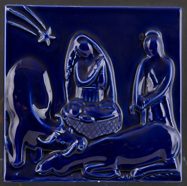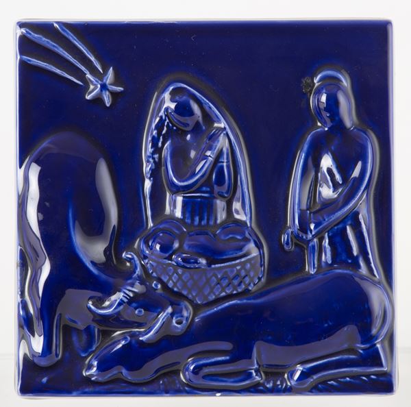 Placca in ceramica invetriata blu raffigurante "NATIVITA' ". 1940. Supporto in plexiglass. Lievi difetti.