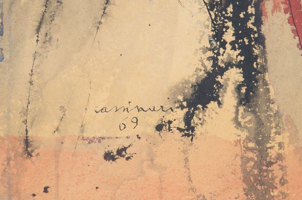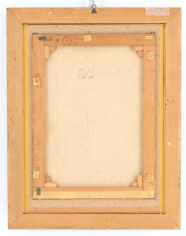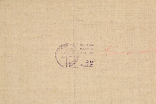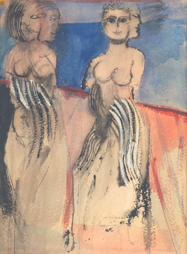 Tecnica mista su tela raffigurante "FIGURE FEMMINILI". Firmata e datata '69 in basso al centro. Con timbro della Galleria Pace, Torino sul retro. In cornice.