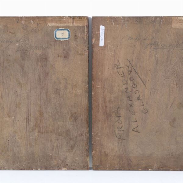 Coppia di dipinti olio su tavola raffiguranti "PESCATORI SULLA SPIAGGIA" e "TRASPORTATORI DI PESCE CON MULI". Lievi difetti.