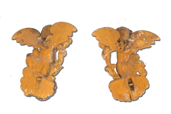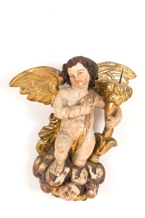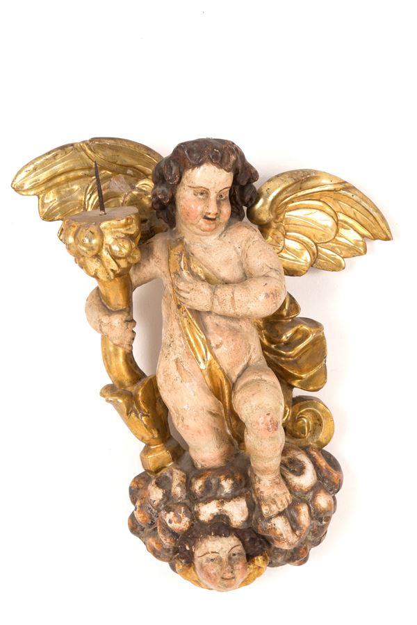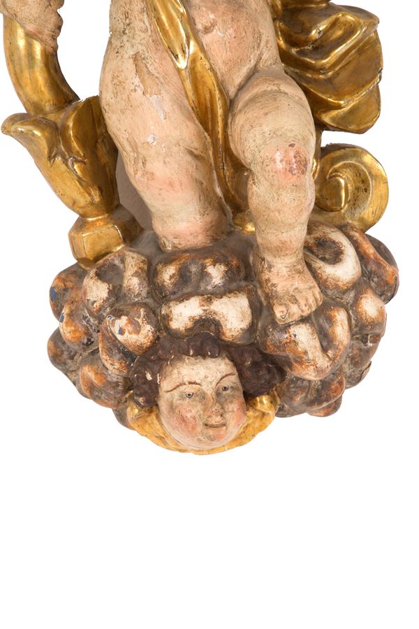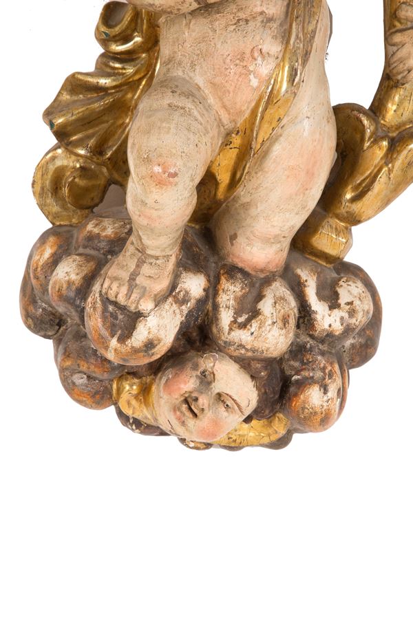 Coppia di angeli portacero in legno laccato e dorato poggianti su nuvole con cherubini. XVII secolo. Difetti e mancanze.