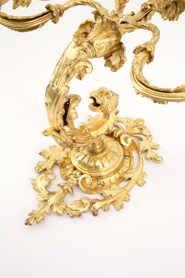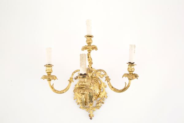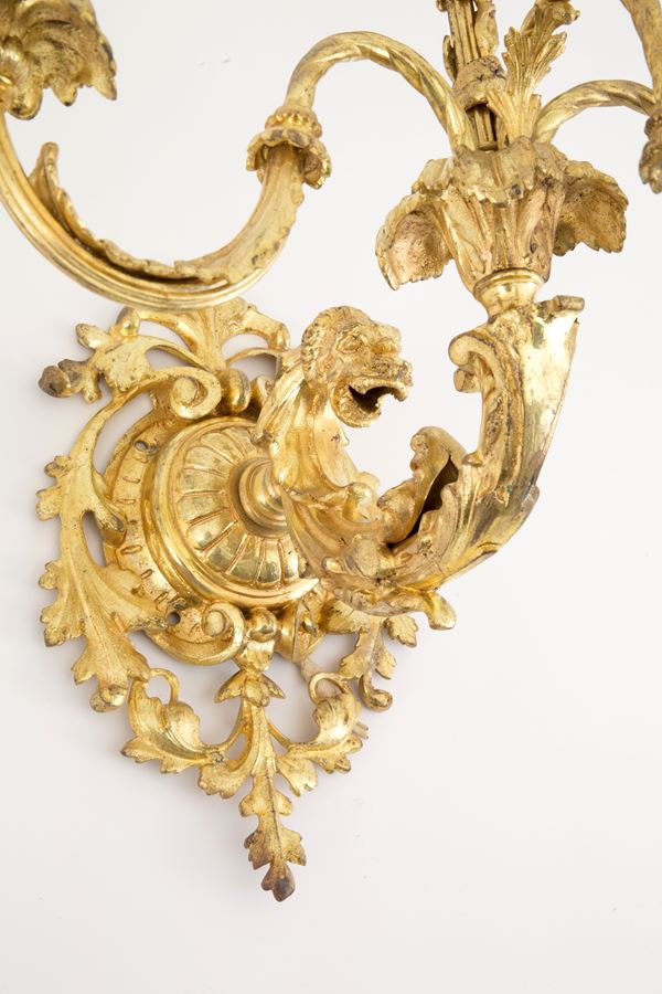 Coppia di applique a quattro fiamme in bronzo dorato. XX secolo. Difetti.