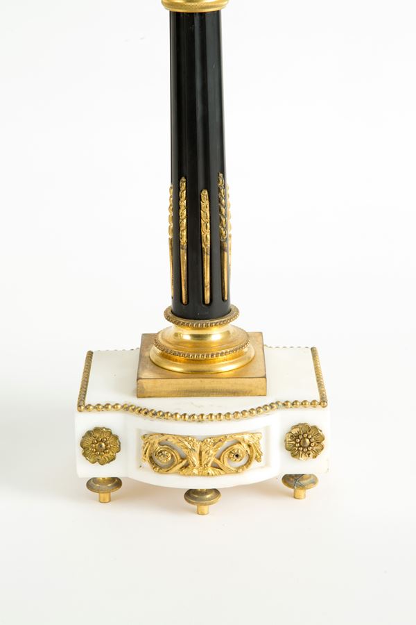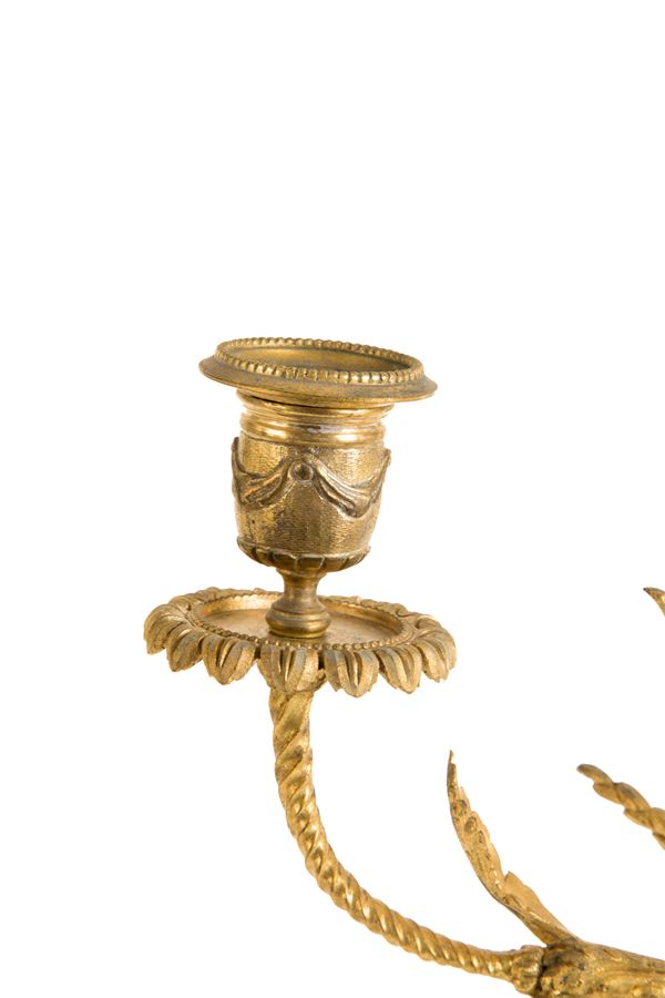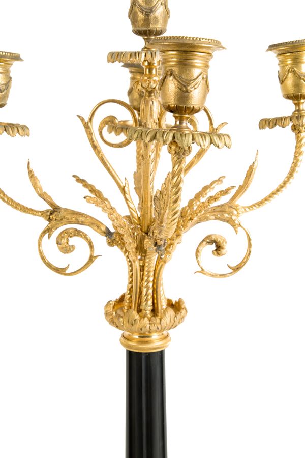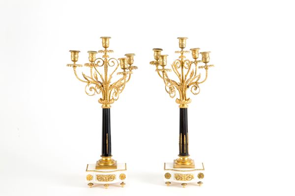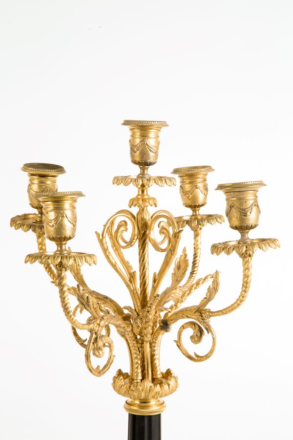 Coppia di candelabri cinque fiamme in bronzo dorato, marmo nero del Belgio e marmo bianco di Carrara con guarnizioni in bronzo dorato. XIX secolo. Lievi difetti.