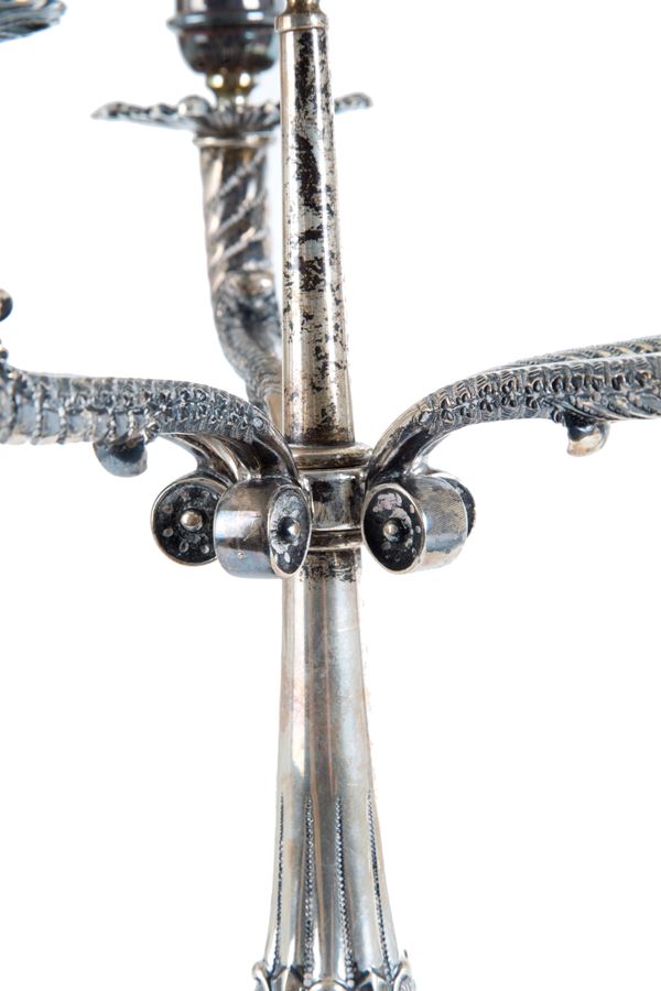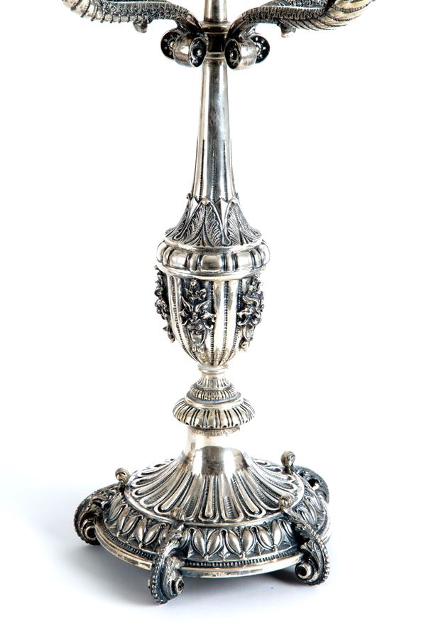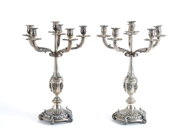 Coppia di candelabri sei fiamme in argento finemente cesellato, gr. 4600 ca. Inizi XIX secolo.