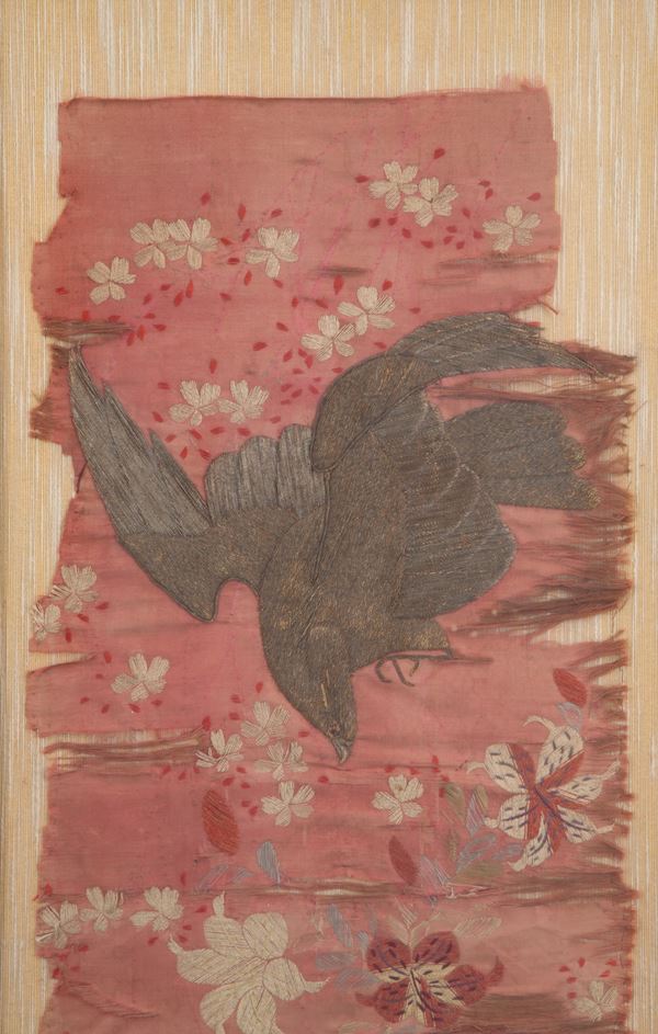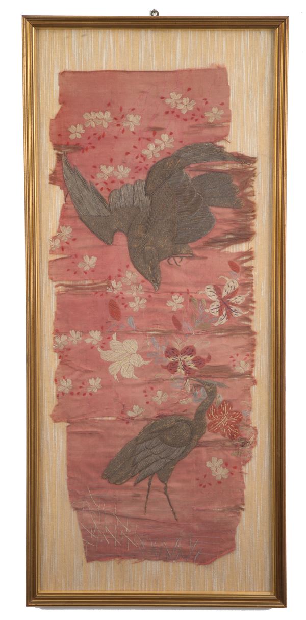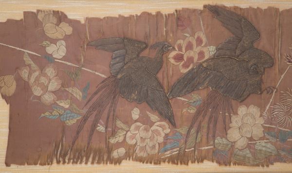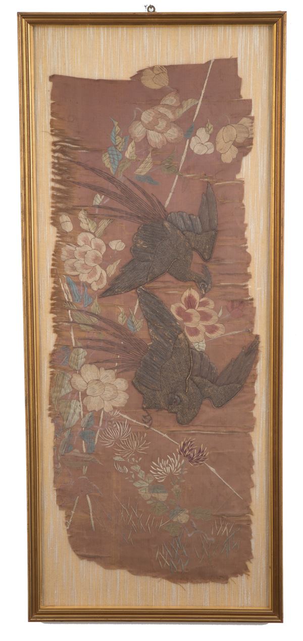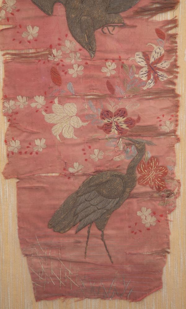 Coppia di frammenti di stoffa ricamata a motivi floreali e volatili in filigrana d'argento. Giappone. In cornici dorate.