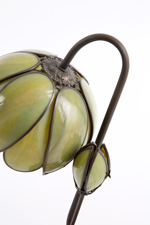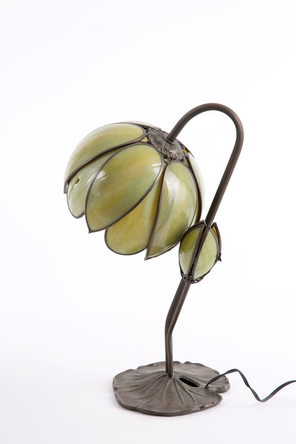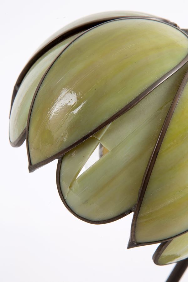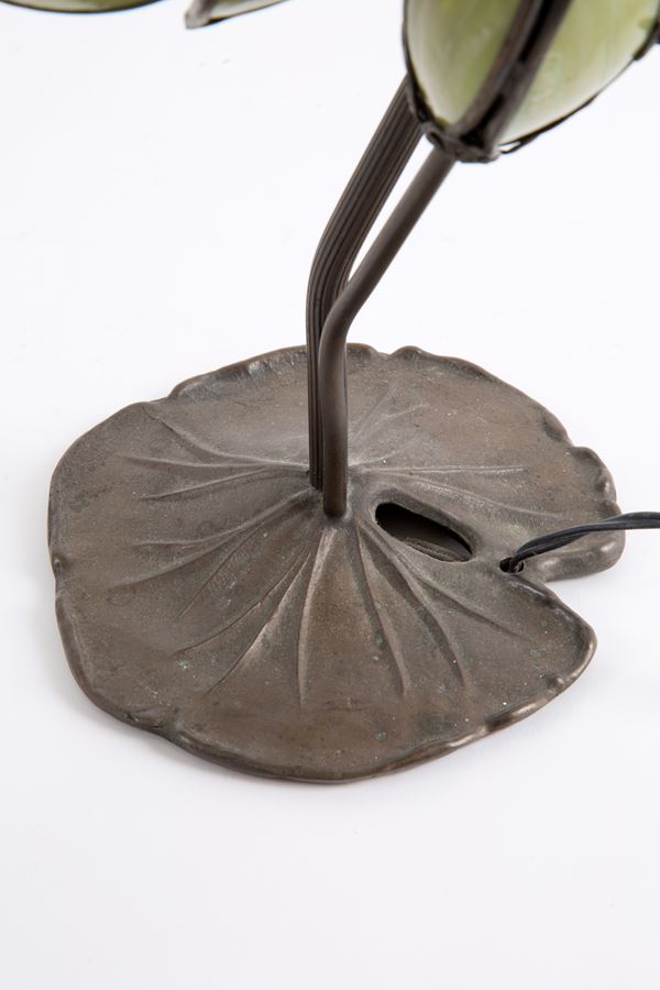 Coppia di lampade da tavolo in bronzo con paralume a forma di fiore in materiale naturale. Inizi XX secolo. Rottura.
