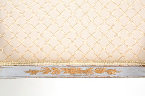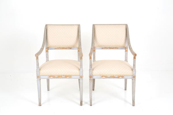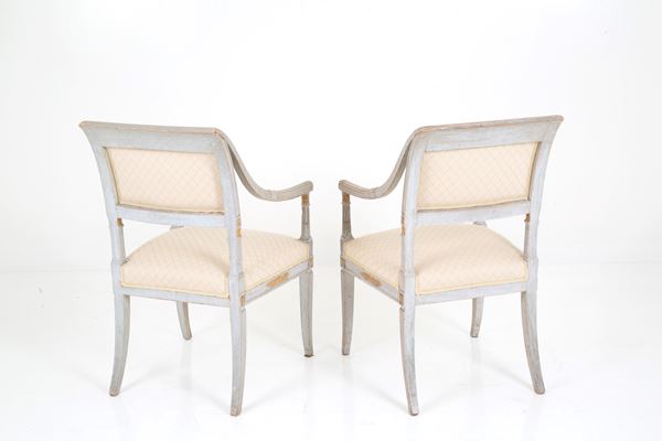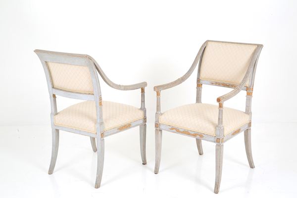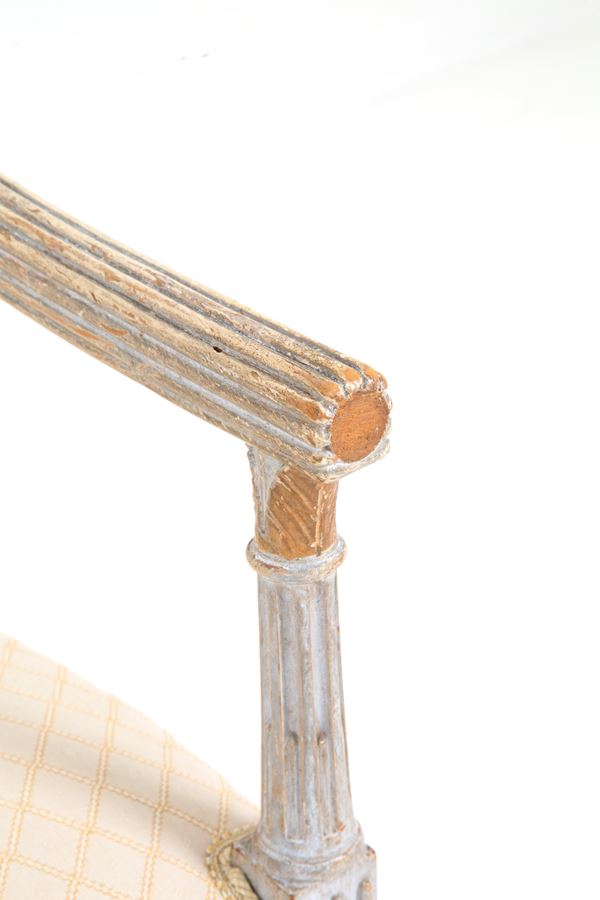 Coppia di poltrone in legno laccato e dorato con gambe a sciabola. Periodo Luigi XVI. Lievi difetti.