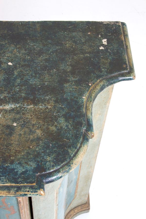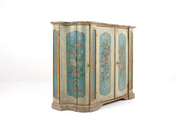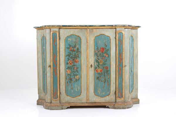 Credenza con due ante frontali dipinte a motivi floreali, due ante mosse laterali in legno laccato e finiture dorate. Italia centrale. XVIII secolo. Difetti.