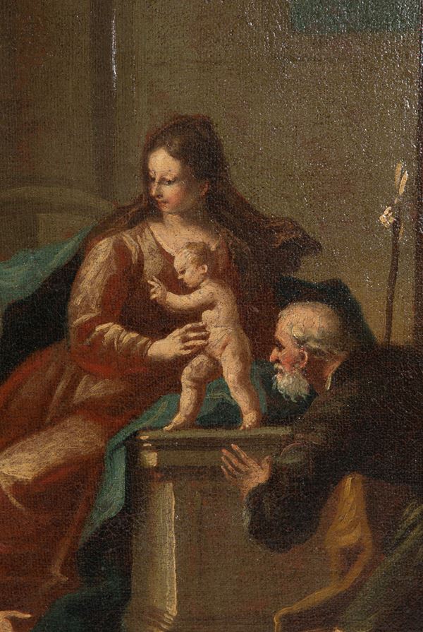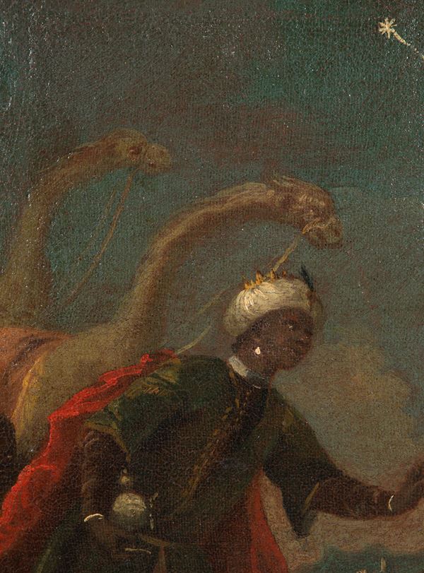 PITTORE VENETO DEL XVIII SECOLO. Dipinto olio su tela raffigurante "ADORAZIONE DEI MAGI". In elegante cornice in legno intagliato e dorato. Lievissimi restauri.