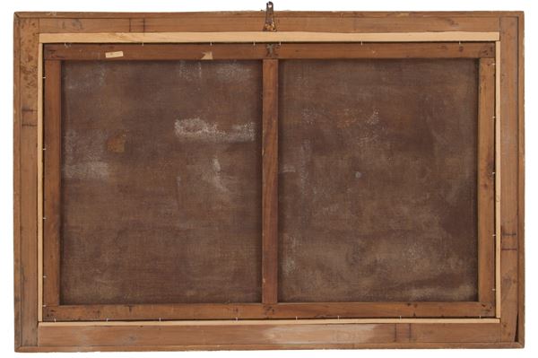 Dipinto olio su tela raffigurante "CAPRICCIO CON BARCHE E FIGURE". Veneto. Fine XVIII secolo. In cornice. Restauri.