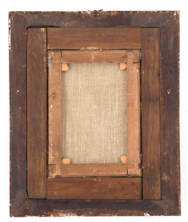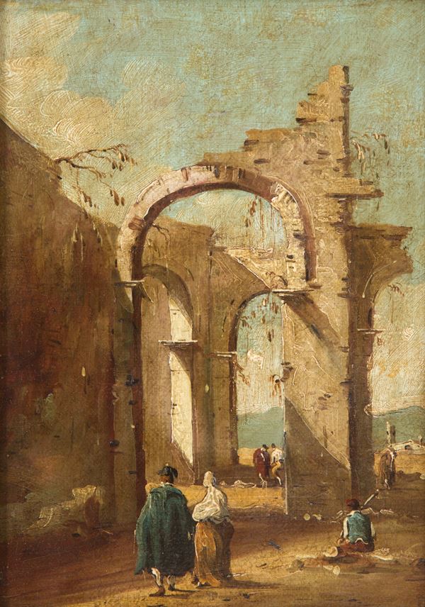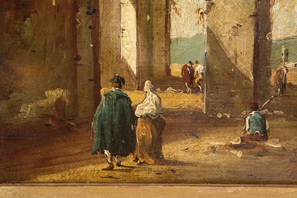 SCUOLA VENETA DEL XVIII SECOLO. Dipinto olio su tela raffigurante "CAPRICCIO CON FIGURE". In cornice in legno dorato. Lievi restauri. Già rintelato e rintelaiato.