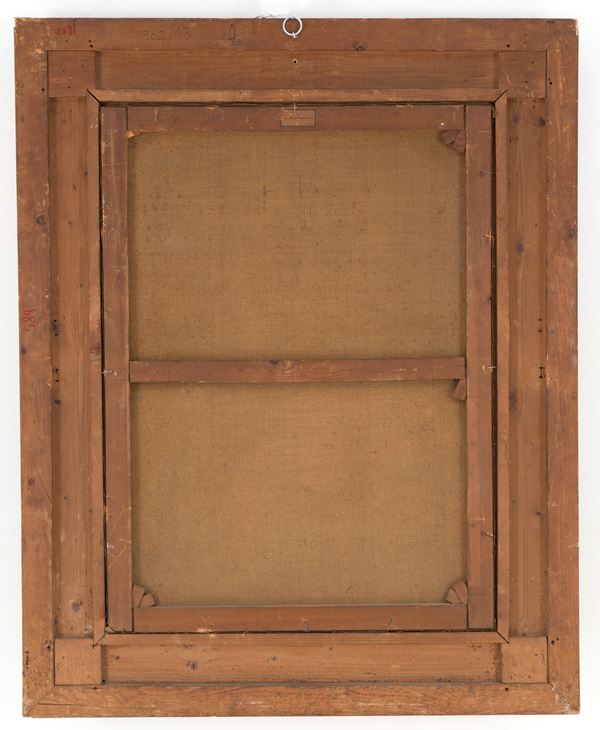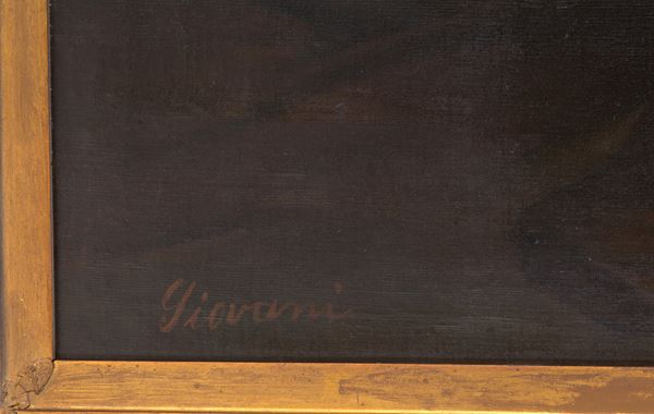 Dipinto olio su tela raffigurante "GIOVANE PESCATORE". Firmato GIOVANI in basso a destra. XVIII secolo. In cornice in legno intagliato, dorato e pastiglia. Già rintelato.