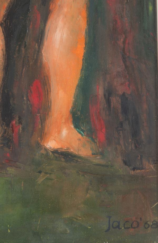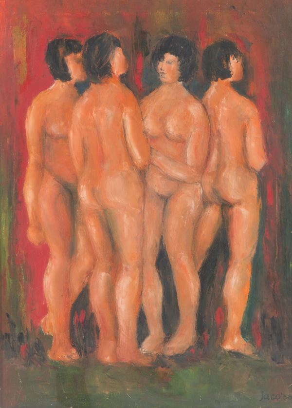 Dipinto olio su tela raffigurante "GRUPPO DI DONNE". Firmato JACO e datato '68 in basso a destra. In cornice.