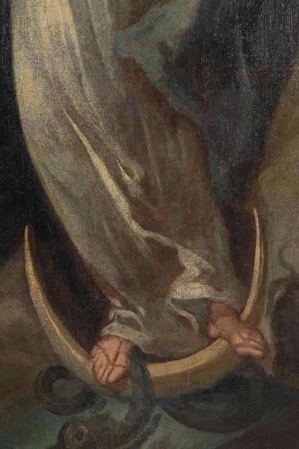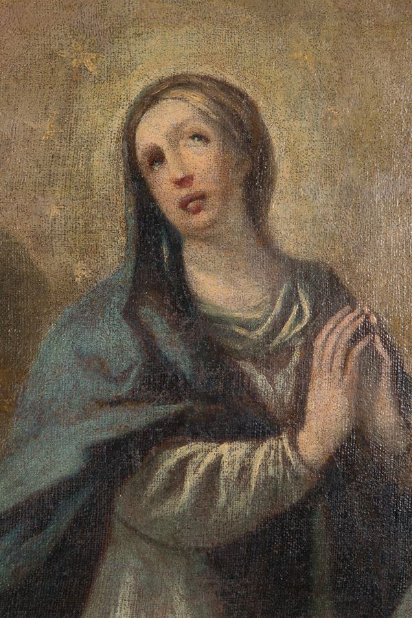 Dipinto olio su tela raffigurante "IMMACOLATA CONCEZIONE". XVIII secolo. Restauri. Già rintelato e rintelaiato.