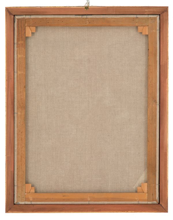Dipinto olio su tela raffigurante "IMMACOLATA CONCEZIONE". XIX secolo. In cornice in legno intagliato e dorato. Difetti e restauri. Già rintelato e rintelaiato.