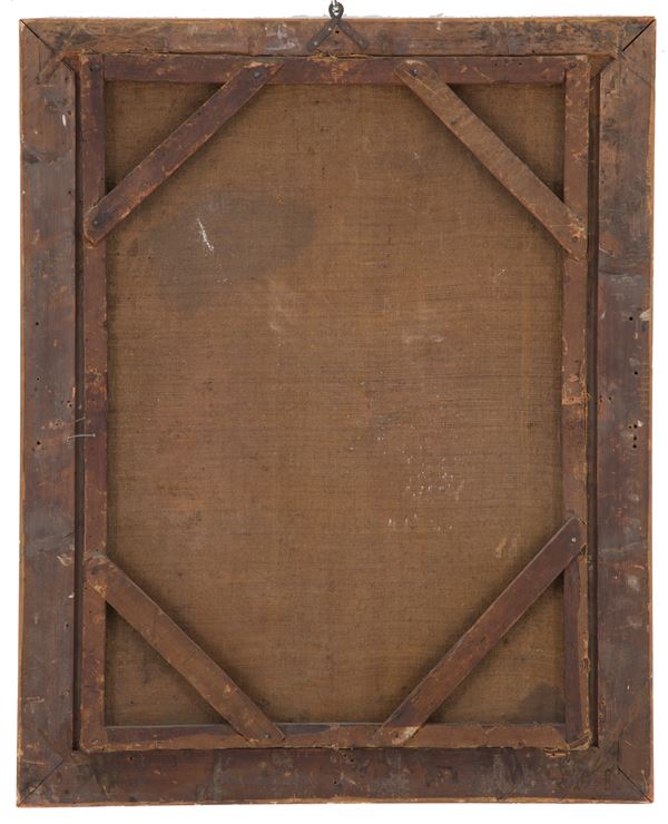 Dipinto olio su tela raffigurante "LA CATTURA DI CRISTO". XVII secolo. In cornice in legno dorato non coeva. Difetti, rotture e restauri. Già rintelato e rintelaiato.
